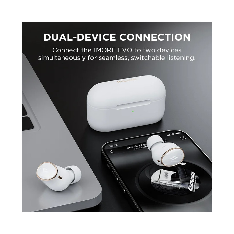 – 1MORE EVO can be connected with two devices simultaneously and effortlessly switch between music, online meetings, videos, and calls on the two connected devices