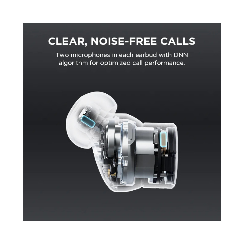 – Four microphones with an A.I. powered DNN algorithm can suppress the ambient noise and amplify your voice, allowing you to have clear and noise-free calls even in the noisiest surroundings