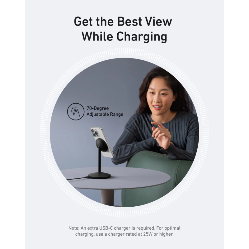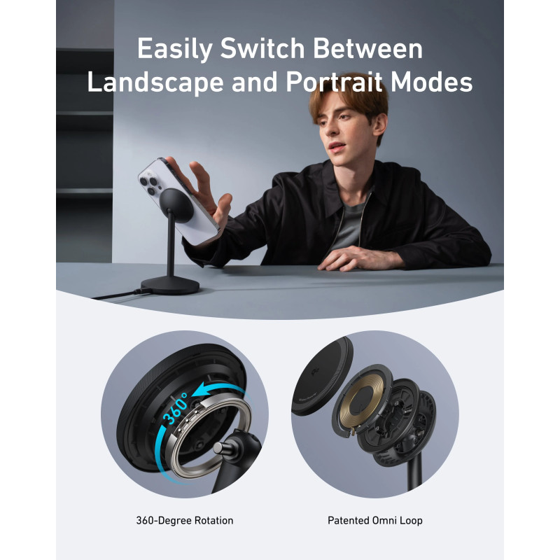 – Opremljen Ankerovim ekskluzivnim rotirajućim mehanizmom, ovaj bežični punjač u potpunosti podržava iPhoneov StandBy način rada, dopuštajući neprimjetan prijelaz između portretne i pejzažne orijentacije dok optimizira potrošnju energije i poboljšava učinkovitost uređaja tijekom punjenja.