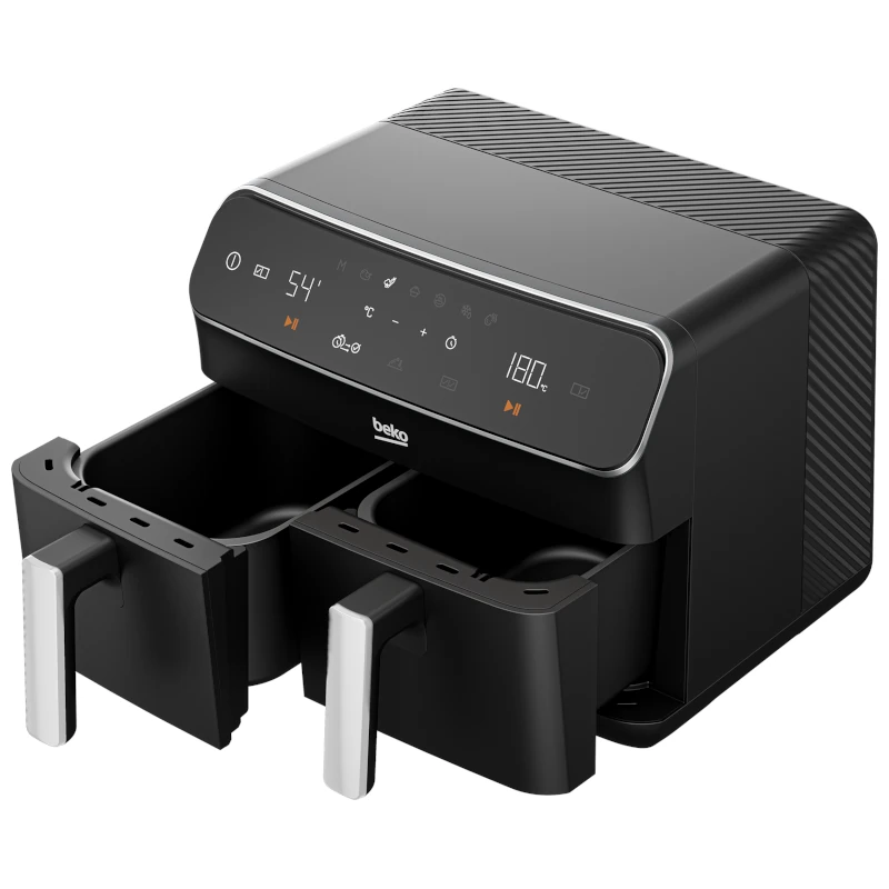 Dual-basket system allows simultaneous cooking of different dishes, finishing at the same time. Effortlessly prepare a meal like crispy chicken and tender vegetables, perfectly synchronized and ready to serve.