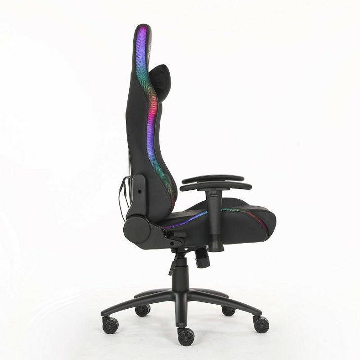 SPEKTAKULARNO RGB OSVJETLJENJE – RGB rubno osvjetljenje donosi Vašem gaming prostoru dodir dinamičkog svjetla dok stvara simfoniju svjetlosti uz nevjerojatnu atmosferu. PROFESIONALNA ERGONOMIJA ZA SAVRŠENU POTPORU – Nasloni za ruke s 2D prilagodbom pruža Vam potpunu kontrolu nad položajem. Hladno prešana pjena unutar stolice uz visoki naslon i prilagodljive jastuke za glavu i leđa pružaju potrebnu udobnost tijekom svake igre.FLEKSIBILNO PODEŠAVANJE – Leptir mehanizam omogućuje jednostavno podešavanje visine sjedala, dok zaključavanje nagiba i mogućnost podešavanja nagiba do 150° pruža Vam potpunu kontrolu nad položajem.ESTETSKA HARMONIJA CRNE BOJE – Dolazi u elegantnoj crnoj boji, ističući profinjenost i ozbiljnost. Okvir od željeza dodaje čvrstoću i dugovječnost, dok 60mm PU kotačići omogućuju glatko pomicanje.Značajke- RGB Rubno Osvjetljenje- 2D Nasloni za ruke- PU koža + Tkanina- Leptir Mehanizam- Metalna Baza- 60mm Kotači- Jastuk za glavu i leđa- Nosivost 150kgSpecifikacije- RGB Gaming stolica s potpornim jastučićima- Nasloni za ruke: 2D- Materijal pokrova stolice: PU koža + tkanina- Materijal unutrašnjosti: Hladno prešana pjena- Dimenzije (cm): 70 x 52 x 127 – 137- RGB rubno osvjetljenje- Napajanje osvjetljenja: 5V uz USB konektor- Tip mehanizma: Leptir- Tip postolja: 350mm metalna baza- Zračni mehanizam podizanja: Klasa 4 / 100mm- Veličina i materijal kotačića: 60mm PU- Jastuk za glavu i leđa od tkanine- Nosivost: 150kg- Širina naslona za ramena: 58cm- Visina naslona: 84cm- Veličina sjedala: 54cm Š x 52.5cm D- Visina sjedala: 47-57cm- Zaključavanje kuta nagiba 15°- Zaključavanje nagiba- Podešavanje nagiba 150°- Boja pokrova stolice: Crna- Materijal okvira: Željezo- Boja okvira: Crna- Potrebna montaža