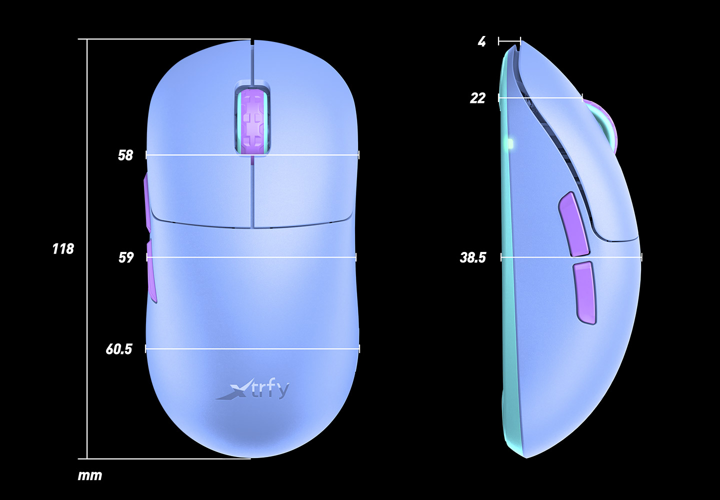M8 WIRELESS. THE AIM CHANGER.- Meet top-tier wireless performance and a shape unlike any other. With its innovative low front, the M8 Wireless is uniquely designed to offer a new level of control and accuracy.ULTRA-LOW FRONT FOR HIGHER PRECISION.- The M8 Wireless is not your standard symmetrical mouse. With a button height as low as 4 millimeters at the front, it allows you to move your fingers closer to the pad for more precision in every swipe.ESPORTS-GRADE WIRELESS PERFORMANCE.- Xtrfy was born out of esports, and performance comes first. We’ve spent the last years developing our wireless technology so that professional gamers can count on it to perform when it matters the most. The M8 Wireless comes with lag-free 1 ms wireless connectivity and Pixart’s highest-performing gaming sensor, 3395.SOLID SHELL. WIRELESS. STILL JUST 55 GRAMS.- Despite being wireless with a 300-mA battery and a hole-free chassis, the M8 is Xtrfy’s lightest mouse yet. Carefully constructed for minimum weight without compromising durability.WHO’S YOUR NEW M8?- Say hello to Frosty Mint, Frosty Purple, White and Black. And guess who’s back? Xtrfy’s popular Retro colorway makes a return in the new M8 series. 5 different editions – choose your favorite.MADE WITH RECYCLED PLASTIC.- We strive towards reducing our carbon footprint wherever possible. The shell of this mouse is made out of 60% recycled plastic..FeaturesWIRELESS ULTRA-LIGHT GAMING MOUSE.- Optimized for esports- Symmetrical shape with ultra-low front- 55 grams lightweight with a solid shell- 2.4 GHz lag-free wirelessSpecifications- Shape: Unique symmetrical shape- Sensor: Pixart 3395 optical gaming sensor- Weight: 55 g- Main switches: Kailh GM 8.0- Glides: PTFE glides- Surface: Matte textured surface- Connection: 2.4 GHz wireless / USB- Connector: USB-A to USB-C cable + Adapter + Dongle- Cable type: 1.8 m Xtrfy EZcord Pro- Battery: 300 mA (up to 75 h*)- CPI settings: 400–26 000- Polling rate settings: 125/500/1000 Hz- Debounce: 2/4/8/12 ms (? 8 ms recommended and covered by warranty)- IPS: 650- Max acceleration: 50 G- OS: Win XP/Mac OSX 10.1 or later