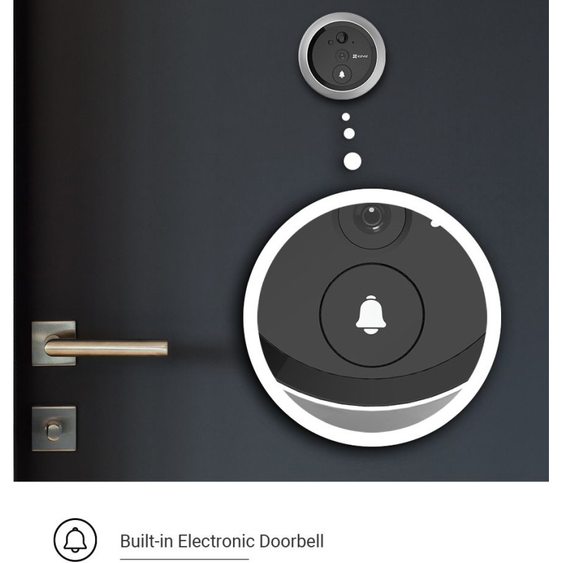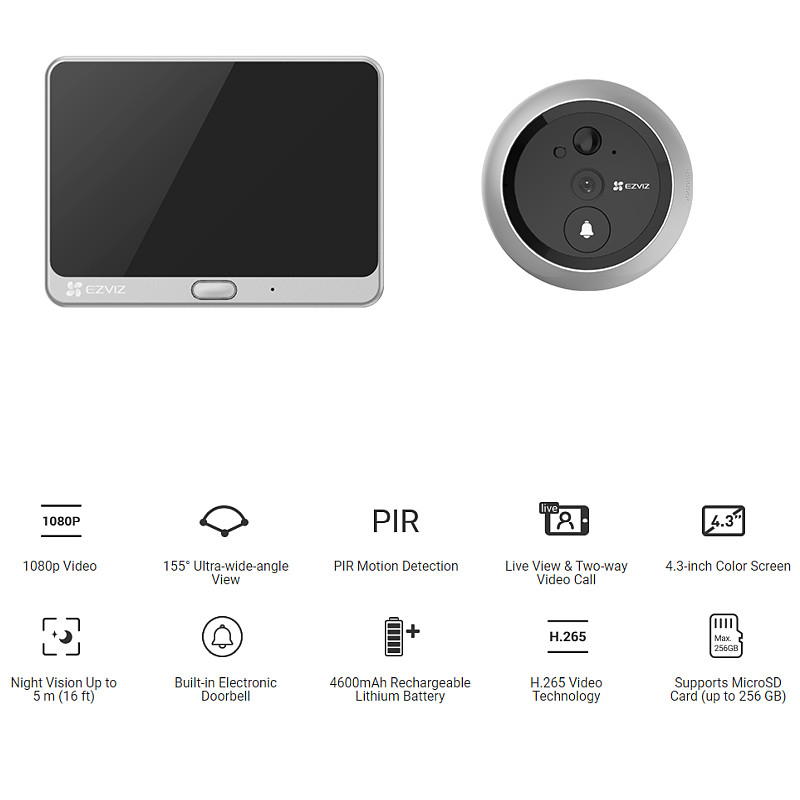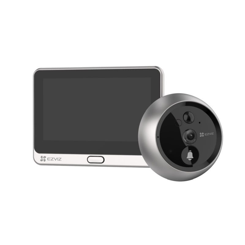 – Wire-free Peephole DoorbellENJOY VISIBLE SECURITY ANYTIME AND ANYWHERE- A two-in-one peephole camera and doorbell, the DP2C features a sleek modern design, as well as multiple advanced features to stand guard at your front door- Youll enjoy its clear imaging, smart functions, and the power to see and talk to visitors via the indoor color monitor- Also, use the EZVIZ App on your mobile device and get alerts for any suspicious activity around your doorstepUPGRADE YOUR DOOR VIEWER WITH 1080p VIDEO QUALITY- The DP2C captures all front-door activities in FHD resolution, and allows real-time video viewing from both the EZVIZ App and the indoor color screen- The large, 4.3″ screen is especially useful for the elderly and children, helping them to see whos outside more easily and clearlyIT RINGS AND LETS YOU KNOW WHOS KNOCKING- When the visitor presses the doorbell button, you hear a pleasant ringtone thanks to the DP2Cs built-in chime, and receive a real-time video call on your phone- This way, youll know how to respond even before you get the doorSMARTER DETECTION WITH REAL-TIME ALERTS- Do you get worried about your home while youre away ?- The DP2C ensures you get mobile alerts about any front-door visitors right away, thanks to its PIR motion detection feature- Whether you live in an apartment with a narrow hallway, or a house with a large front yard, you can always customize your alert trigger conditions by selecting one of three levels of detection sensitivityBRILLIANT VISION TO REDUCE BLIND SPOTS, EVEN IN DIM LIGHT- The DP2C provides optimal visual coverage with its 155-degree ultra-wide-angle lens, and renders sharp night vision of objects up to 5 meters away- It is also smart enough to automatically shift between day and night modesSTURDY AND STYLISH DESIGN- Thoughtfully designed, the DP2C fits seamlessly onto your door with easy installation- The exterior camera features an anti-prying design so its fully tamperproof, protecting your familys privacyLONG-LASTING PROTECTION WITH 3-MONTH BATTERY LIFE- Equipped with a built-in 4600 mAh rechargeable lithium battery, the DP2C ditches any complex wiring- The extended standby time reaches up to 90 days with its smart power-saving functionalityWE PROTECT YOUR DATA AND PRIVACY- Protecting your data and privacy is our highest priority- Data transmission between the device and the EZVIZ Cloud is encrypted from end to end- Only you have the keys to decrypt your data* AES 128-bit encryption, TLS encryption protocol, Multi-step authenticationSpecificationsINSTALLATION PARA;ETERS- Supported Hole Diameter: 16.5 to 50 mm- Supported Door Diameter: 35 to 105 mmCAMERA PARAMETERS- Sensor: 1/3″ Progressive Scan CMOS- Lens: 2.0 mm @ F2.2, visual angle (diagonal):155°- Day/Night Switch: ICR infrared filter- IR Distance: max. 5m- Max. Resolution: 1080p / 2MP- Video Frame Rate: 15fpsPIR DETECTION- Angle: 110°- Distance: max. 6.0m- Sensitivity: AdjustableINTERFACE- Storage Interface: MicroSD card slot (max. 256 GB)- Audio Input: Built-in high sensitivity microphone- Audio Output: Built-in high-power speaker- Buttons: Doorbell button, power button, Screen wake up buttonNETWORK- Face Detection: Does not support- Intelligence Alarm: PIR motion detection- Protocol: EZVIZ Cloud Proprietary Protocol- Video Intercom: Local and remote video intercom- General Function: Cloud video encryption and image encryptionWIRELESS- Wi-Fi Standard: IEEE802.11b, 802.11g, 802.11n- Frequency Range: 2.4 GHz – 2.4835 GHz- Channel Bandwidth: Supports 20 MHz- Security: 64/128-bit WEP, WPA/WPA2, WPA-PSK/WPA2-PSK, WPS- Transmission Rate: 11b: 11Mbps, 11g :54Mbps, 11n :150MbpsGENERAL- Screen: 4.3″ color screen- Color: Silver- Operating Conditions: -10°C to 45°C (14°F to 113 °F ), Humidity 95% or less (non-condensing)- Power Supply: DC 5V (+/-10%)- Power Consumption: max. 2.2W- Dimension:* Screen and Base: 115.5×85.5×24.5 mm* Peephole Doorbell: 71×71×48.3 mm- Weight 302 gCERTIFICATIONS- UL / FCC / CE / WEEE / REACH / RoHSIN THE BOX- DP2C Peephole Doorbell- Panel- Mounting Base- Power Cable (1.0 m)- Screws ×6- Quick Start Guide