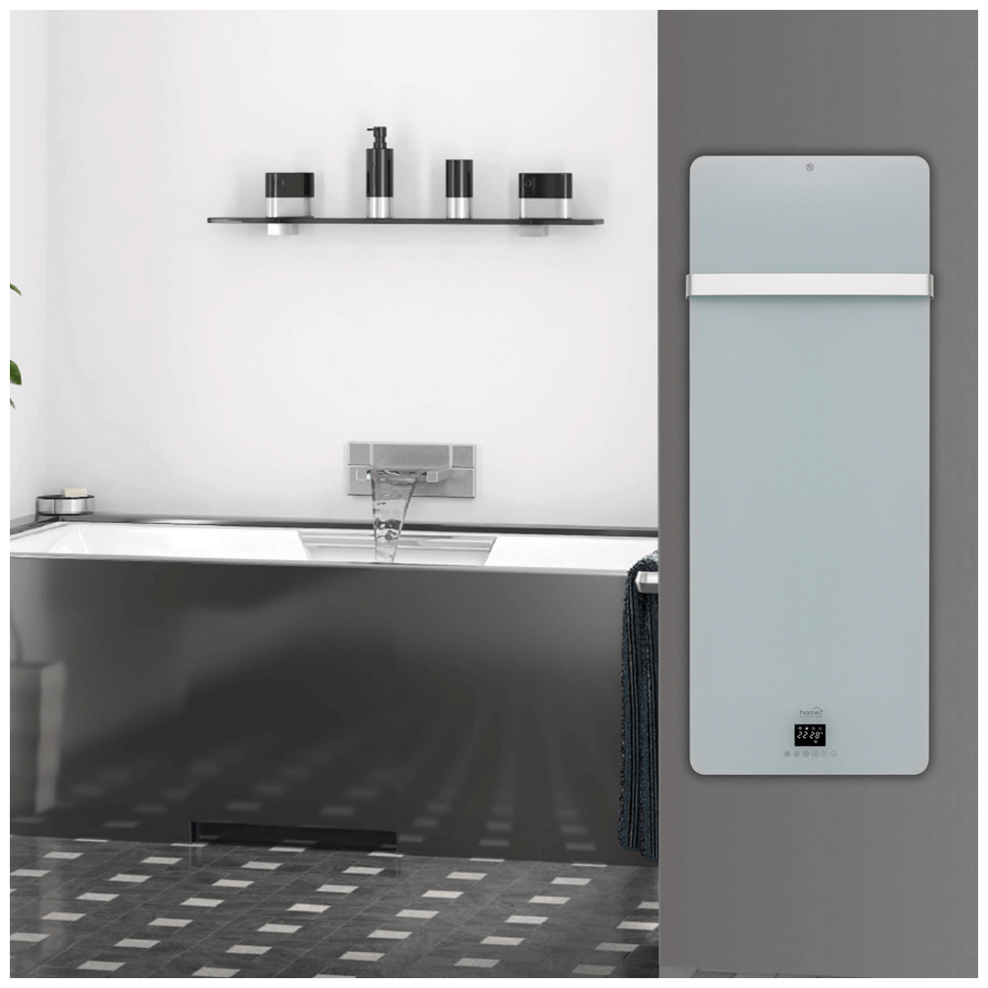 LED display, staklena metalna prednja strana i metalna šipka za ručnike, timer 24 h, tjedni program, elelektronički termostat, 2 nivoa grijanja, dječija brava.