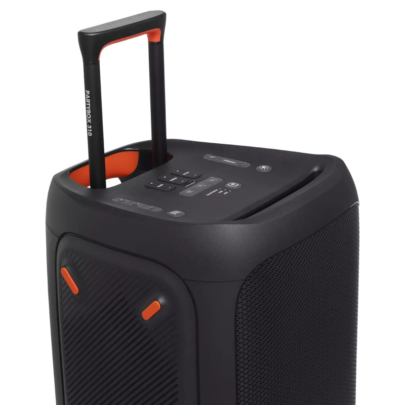 Features- Powerful JBL Pro Sound- Light up the night- Keep the party going- IPX4 splashproof- Connect compatible speakers wirelessly via TWS (True Wireless Stereo using Bluetooth connection up to 2 party speaakers)- DJ in the dark- convenient built-in backlighting that activates in the dark- Control your party from your phone with the PartyBox app- Built-in karaoke mode- Telescopic handle and built-in smooth glide wheelsSpecifications- Bluetooth version: 5.1- Maximum music playing time: 18 hrs- Output power: 240 W – Bluetooth profiles: A2DP 1.3, AVRCP 1.6- Bluetooth frequency: 2.4 – 2.48GHz- Bluetooth transmitted modulation: GFSK, ?/4 DQPSK, 8DPSK- Bluetooth transmitter power: 15dBm (EIRP)- Dynamic frequency response range (Hz)45 Hz – 20 KHz (-6 dB)Dimensions- Dimensions: 68.8 x 32.6 x 36.8 cm- Weight: 17.42 kg- Control and Connection Specifications- Bluetooth profilesA2DP 1.3, AVRCP 1.6- Bluetooth frequency2.4 – 2.48GHz- Bluetooth transmitted modulationGFSK, ?/4 DQPSK, 8DPSK- Bluetooth transmitter power15dBm (EIRP)Battery- Battery TypeLithium-ion 72Wh- Charging time: 3.5 hrsFeatures- 3.5 mm audio cable Input: Yes- Bluetooth: Yes- Charging cable: Yes- Karaoke function: Yes- Lightshow: Yes- Splashproof: Yes- Wireless: Yes- Rechargable battery: Yes- True Wireless: Yes
