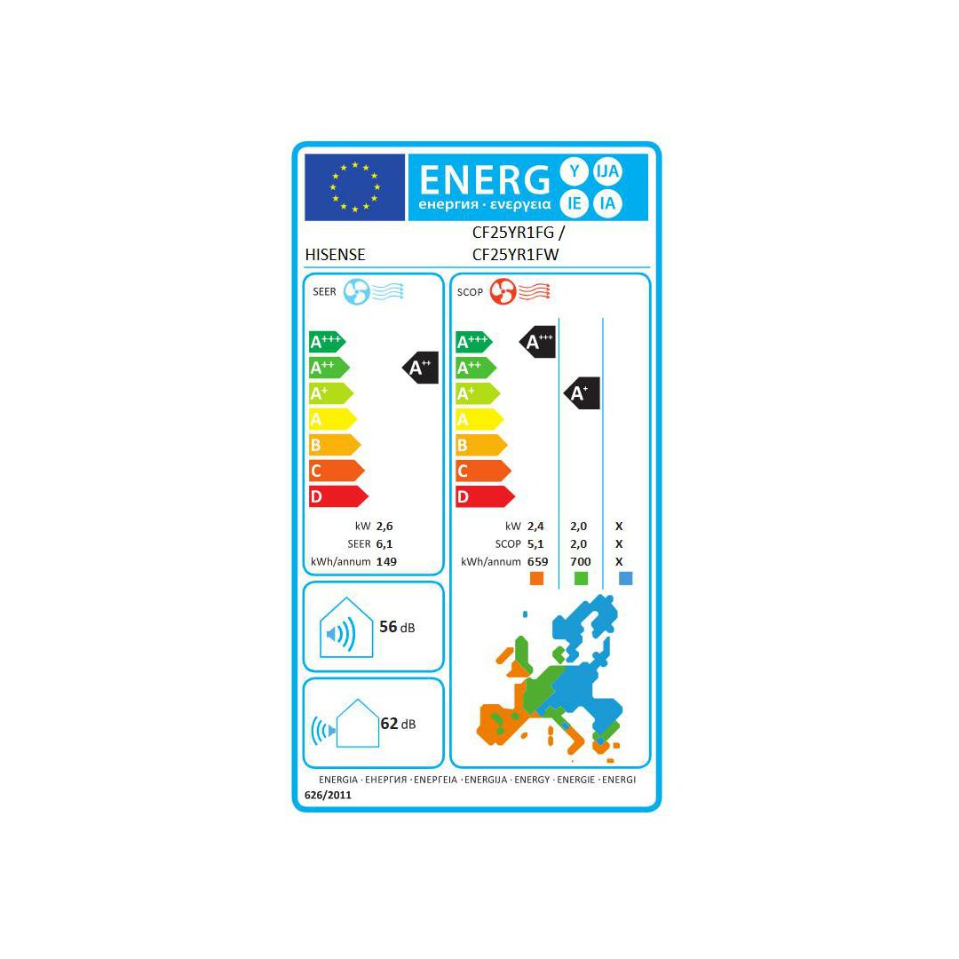 Hisense inverterski klima uređaj rashladne snage: 2,6 kW, snaga zagrijavanja: 2,7 kW. Kapacitet hlađenja (Btu/h): 9000, kapacitet grijanja (Btu/h): 9000. Moguće upravljanje putem Wi-Fi mreže. Energetski razred: A++.
