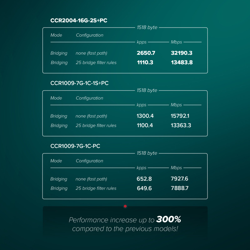 – So as you can see – no bottlenecks. As long as the CPU can handle the processing, all ports can reach wire speed. And this CPU is a beast that can handle a lot. If we look at the performance, you can see that it is trading blows with our CCR1009.