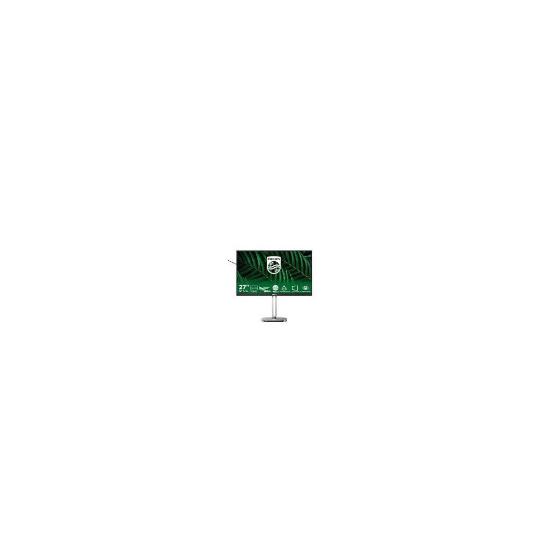 – Ovaj monitor osmišljen je za energetsku učinkovitost. LightSensor i PowerSensor dvije su značajke koje zajedno omogućuju monitor koji štedi energiju i predstavlja odličnu sveobuhvatnu opciju za ured- Brzo osvježavanje od 100 Hz za izuzetno glatku sliku- 100 % reciklabilni materijal i ambalaža s FSC certifikatom- Postolje i stalak od 100 % recikliranog aluminija- LightSensor za savršenu svjetlinu uz minimalno napajanje- PowerSensor smanjuje troškove za energiju do 80%- Zaštita od plave svjetlosti s certifikatom Eyesafe i preciznost boja- Tehnologija SoftBlue – za ugodniji doživljaj gledanja- Gledanje ugodno za oči uz način rada LowBlue Mode i bez treperenjaSpecifikacijaSLIKA / ZASLON- Veličina zaslona: 27″ / 68.5 cm- Omjer širine i visine: 16:9- Vrsta LCD zaslona: Tehnologija IPS- Vrsta pozadinskog osvjetljenja: W-LED sustav- Razmak piksela: 0.3114 (V) mm × 0.3114 (O) mm- Svjetlina: 300 cd/m2- Boje zaslona: 16.7 milijuna (8 bita)- Paleta boja (uobičajeno): sRGB 110%, NTSC 96%- Omjer kontrasta (uobičajeno): 1500:1- SmartContrast: 50.000.000:1- Vrijeme odziva (uobičajeno): 4 ms (od sive do sive)- Kut gledanja: 178o (V)/178o (O) @ C/R > 10- Napredne značajke slike: SmartImage- Maksimalna razlučivost:* VGA: 1920×1080 @75 Hz* HDMI/DP: 1920×1080 @100 Hz- Efektivno područje pregleda: 597.89 (V) × 336.31 (O) mm- Frekvencija skeniranja:* VGA: 30k – 85 KHz (V) / 48 – 75 Hz* HDMI/DP: 30K – 115 KHz (V) / 48 Hz – 100 Hz (O)- sRGB: Da- Bez titranja: Da- Gustoća piksela: 82 PPI- LowBlue Mode: Da- Premaz zaslona monitora: Sprječava odbljesak, 3H, neprozirnost 25%- EasyRead: Da- Prilagodljiva sink.: Da- EyeSafe: DaPOVEZIVANJE- Signalni ulaz: VGA, HDMI 1.4, DisplayPort 1.2- Ulaz sinkronizacije:Odvojena sinkronizacija, Sync on Green- Audio (ulaz/izlaz): Audioulaz, audioizlaz- HDCP: HDCP 1.4 (HDMI/DisplayPort)- USB čvorište:* 4× USB 3.2, Gen 1 (5 Gb/s) preuzimanje (uz 1 za brzo punjenje B.C 1.2)* 1× USB-B slanje (podaci)PRAKTIČNOST- Ugrađeni zvučnici: 3W ×2- Kompatibilnost za Plug & Play: DDC/CI, Mac OS, sRGB, Windows 11/0- Praktične značajke: SmartImage, Ulaz, Svjetlina, Izbornik, Uključeno/isključeno- Dodatne pogodnosti: Kensington brava, VESA stalak (100×100 mm), kuka za slušalice- Upravljački softver: SmartControlPOSTOLJE- Regulator visine: 150 mm- Zakretanje: -/+ 90 stupnjeva- Zakretanje: -/+ 180 stupnjeva- Nagib: -5/30 stupnjaPOTROŠNJA / SNAGA- Način rada ECO: 7.2 W (uobičajeno)- Napajanje: Ugrađeno, 100-240 V AC, 50-60 Hz- Isključeno: 0.3 W (uobičajeno)- Uključeno: 9.34 W (uobičajeno) (metoda ispitivanja EnergyStar)- Stanje pripravnosti: 0.3 W (uobičajeno)- LED indikator napajanja: Tijekom rada – bijela; Način rada pripravnosti – bijela (bljeska)- Energetska klasa: BDIMENZIJE / MASA- Proizvod bez postolja: 614×368×58 mm- Proizvod s postoljem (maks. visina): 614×543×235 mm- Proizvod s postoljem: 6.46 kg- Proizvod bez postolja: 4.70 kgRADNI UVJETI- Nadmorska visina: Tijekom rada: +12.000 stopa (3.658 m), Kada ne radi: +40.000 stopa (12.192 m)- Raspon temperature (rada): 0°C do 40°C- Relativna vlažnost: 20% – 80%- Raspon temperature (skladištenje): -20°C do 60°C- MTBF (dokazano ispitivanjem): 70.000 h (bez pozadinskog osvjetljenja)ODRŽIVOST- Okoliš i energija: PowerSensor, LightSensor, Energy Star, EPEAT, RoHS- Plastika dobivena recikliranjem iskorištenih proizvoda: 85%+OBP 5%- Ambalaža se može reciklirati: 100%- Specifične tvari: Kućište ne sadrži PVC/BFR, ne sadrži živuSUKLADNOST I STANDARDI- Propisi i odobrenja: CB, CE oznaka, TUV/GS, TUV Ergo, Certifikat TCO, EAC, EAEU RoHS, UKCA, EMF, FCC, ICES-003, Certifikat za eyesafe® 2.0, TUV Rheinland Low Blue Light (hardversko rješenje)KUĆIŠTE- Završna obrada: Naglašena tekstura- Postolje: Srebrno- Prednja ploča: Tamnosiva- Stražnji poklopac: TamnosiviŠTOSE NALAZI U PAKIRANJU ?- Kabeli: HDMI kabel, DisplayPort kabel, kabel za napajanje- Monitor s postoljem: Da- Korisnička dokumentacija: Da