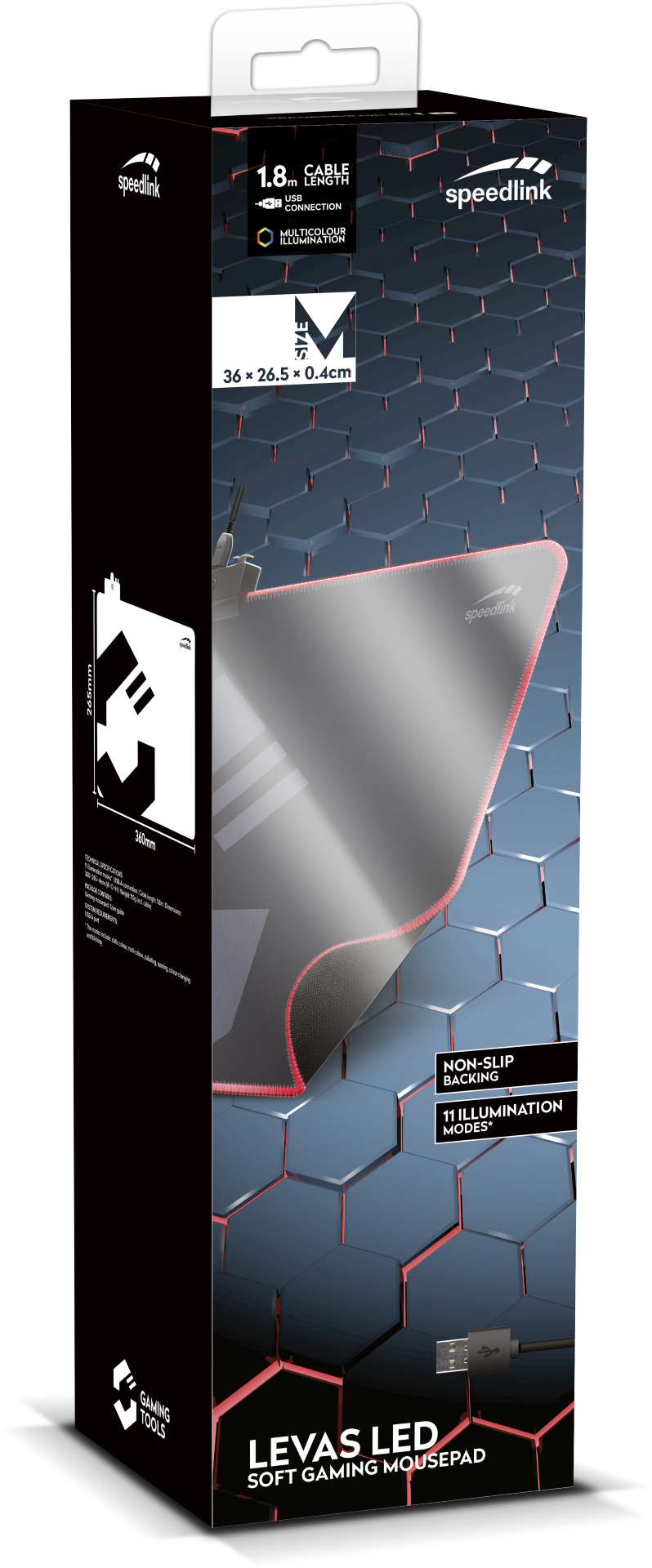 LEVAS LED Mekana Gaming Podloga za miš, podržava svaki pokret sa stilom. Jedanaest višebojnih načina osvjetljenja može se lako promijeniti okretanjem prekidača tako da boja uvijek odgovara okolini. Pogodna za sve senzore miša, glatka površina olakšava apsolutno savršenstvo čak i kod najmanjih pokreta. Također protu klizni materijal jamči savršeno držanje miša na podlozi čak i tijekom jako brzih pokreta. Podloga je odlična i lako prenosiva kada se smotati. Obloženi kabel čini ga jednako dugotrajnim koliko i elegantnim. Dimenzija 360 x 265 x 4 mm omogućuje duge pokrete bez zauzimanja previše prostora.
