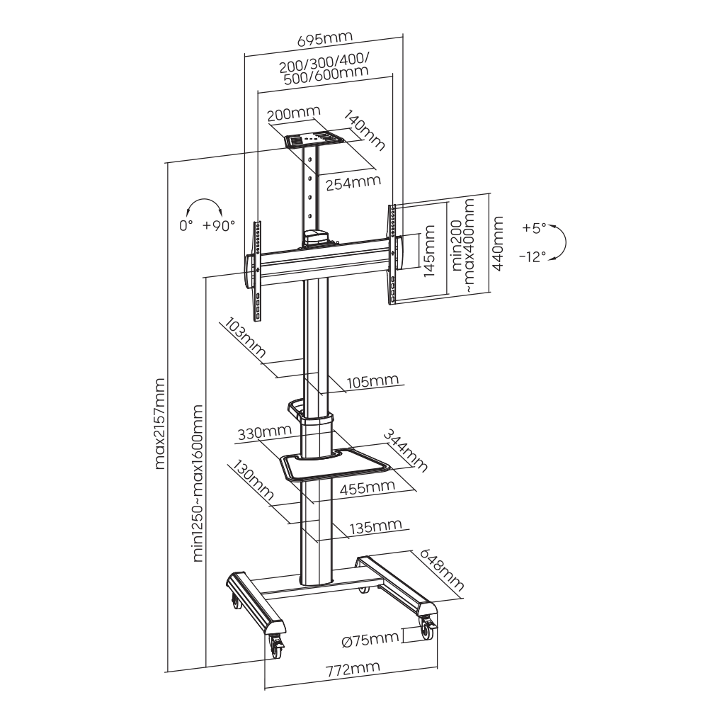 Podešavanje visine: 1200-1600 mm (ukupna visina uključujući policu za projektor 2157mm)
