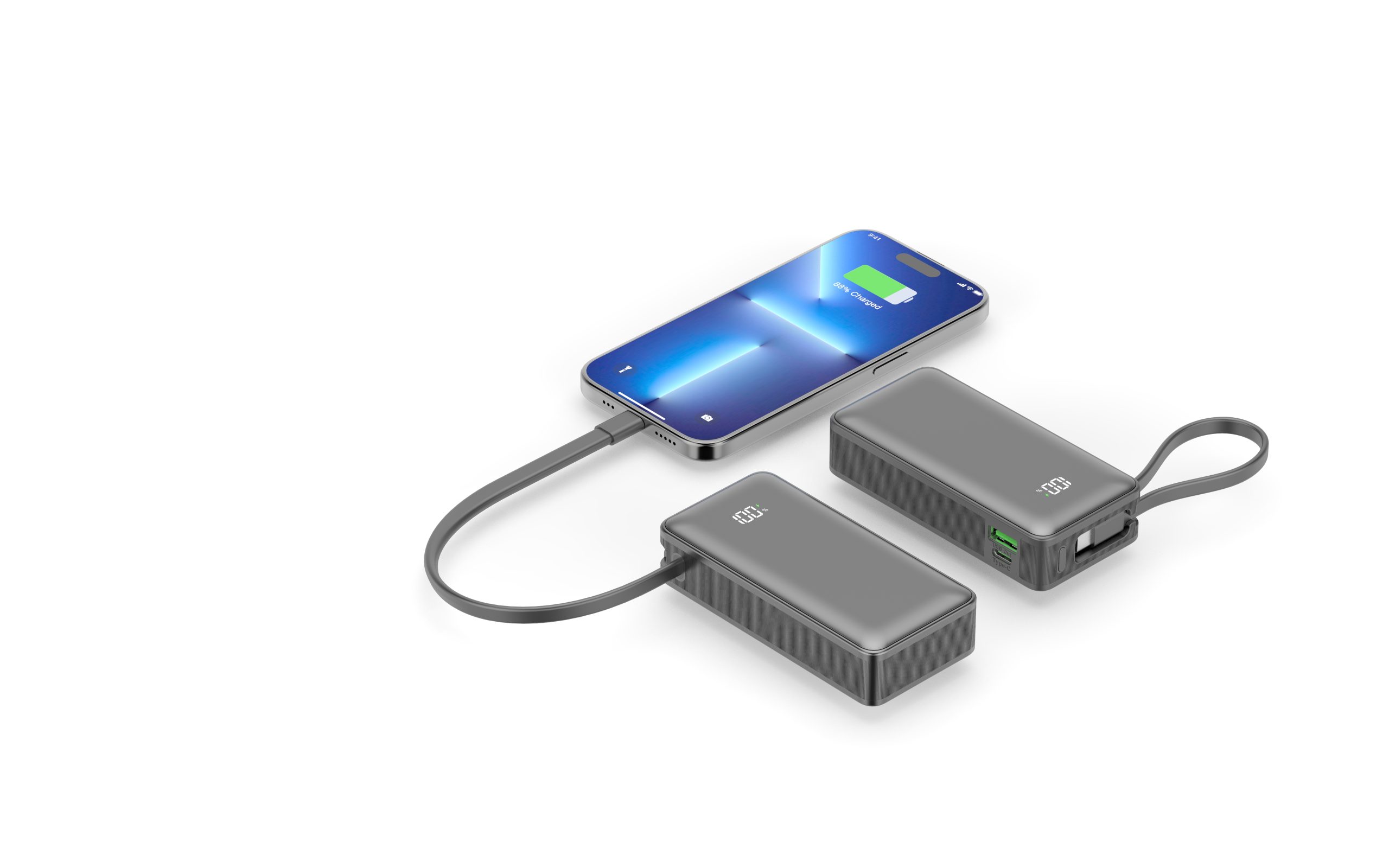 Ugrađeni brzopuneći kablovi omogućuju punjenje bez potrebe za dodatnim kabelima, dok LCD digitalni zaslon u stvarnom vremenu prikazuje preostali kapacitet baterije za potpunu kontrolu.