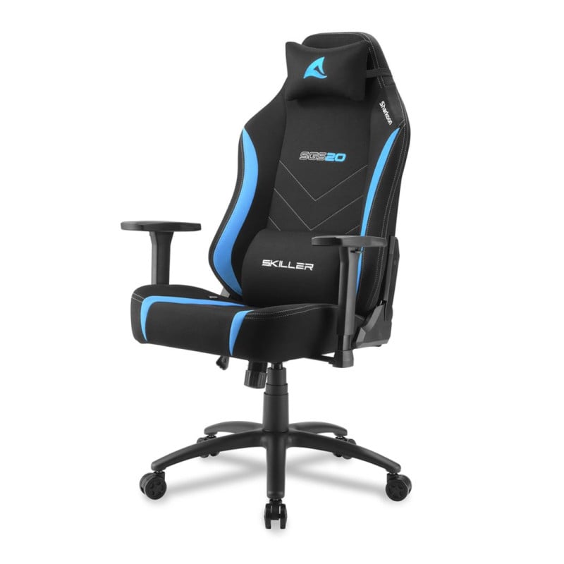 – With the SKILLER SGS20 there is now an affordable chair with a particularly large seat base and the expected high quality of a Sharkoon gaming chair. Its comfortable upholstery allows you to sit for hours without interruption. By relieving pressure on the spine, the headrest and lumbar cushions support the back and neck and thus promote a healthy posture when sitting. The robust frame and the class-4 gas lift piston ensure a stable hold in hectic situations.Sporty designed fabric cover- In a classic fabric cover, the SKILLER SGS20 impresses with its sporty, elegant design, the contour seams and color accents on the backrest and seat base. The gaming chair is also breathable, so you can sit on it for hours without interruption, even on hot summer days.Lots of Room- Its 55 cm wide seat base offers enough space even for large people who want to make themselves comfortable on their gaming chair.Especially Ergonomic- The seating height of the SKILLER SGS20 can be effortlessly adjusted to always allow the perfect sitting position. The height and direction of the armrests can also be adjusted in a few simple They can also be moved back and forth. The chair can therefore be adjusted to individual requirements at any time. The headrest and lumbar cushions support the spine by relieving it of pressure when sitting for long periods. This promotes the correct sitting posture and effectively prevents neck and back pain.Ideal for Relaxation- In addition to the integrated tilt mechanism, the backrest can also be reclined by up to 160 degrees. Together, these functions enable moments of relaxation while taking a short a break before the next gaming session begins.Weight Capacity up to 120 Kilograms- Thanks to its stable steel frame construction and the class-4 gas lift piston, the SKILLER SGS20 reliably supports a weight of up to 120 kg. It is also suitable for users up to 185 cm in height.SpecificationsGeneral- Foam Type: High-Density Mould Shaping Foam- Foam Density: 45 – 50 kg/m3- Frame Construction: Steel (Diameter: 19 mm)- Seat Cover Material: Fabric- Color: Blue- Adjustable Armrests: 3D- Armrest Pad Size (L x W): 26 x 9 cm- Mechanism: Conventional Tilt- Tilt Lock: Yes- Adjustable Tilt Angle: 3° – 18°- Gas Lift Piston: Class-4- Seat Back Style: High-Back- Adjustable Back Angle: 90° – 160°- Headrest & Lumbar Cushion: Yes- Headrest & Lumbar Cushion Cover Material: Fabric- Five-Star Base: Steel Five-Star Base- Wheel Size: 60 mm- Assembly Required: YesSafety Certifications- Chair (General): DIN EN 1335-1/2- Gas Lift Piston: EN 16955Weight & Dimensions- Seating Size (W x D): 55 x 50.5 cm- Maximum Seating Height: 57 cm- Minimum Seating Height: 47 cm- Max. Armrest Height from Floor: 79.5 cm- Min. Armrest Height from Floor: 63 cm- Backrest Height: 80 cm- Backrest Shoulder Width: 54 cm- Package Size (L x W x H): 86 x 70 x 33 cm- Max. Height of Recommended User: 185 cm- Weight: 20.9 kg- Max. Weight Capacity: 120 kg- Package Contents* SKILLER SGS20 Fabric* Headrest & Lumbar Cushion* Manual* Accessory Set