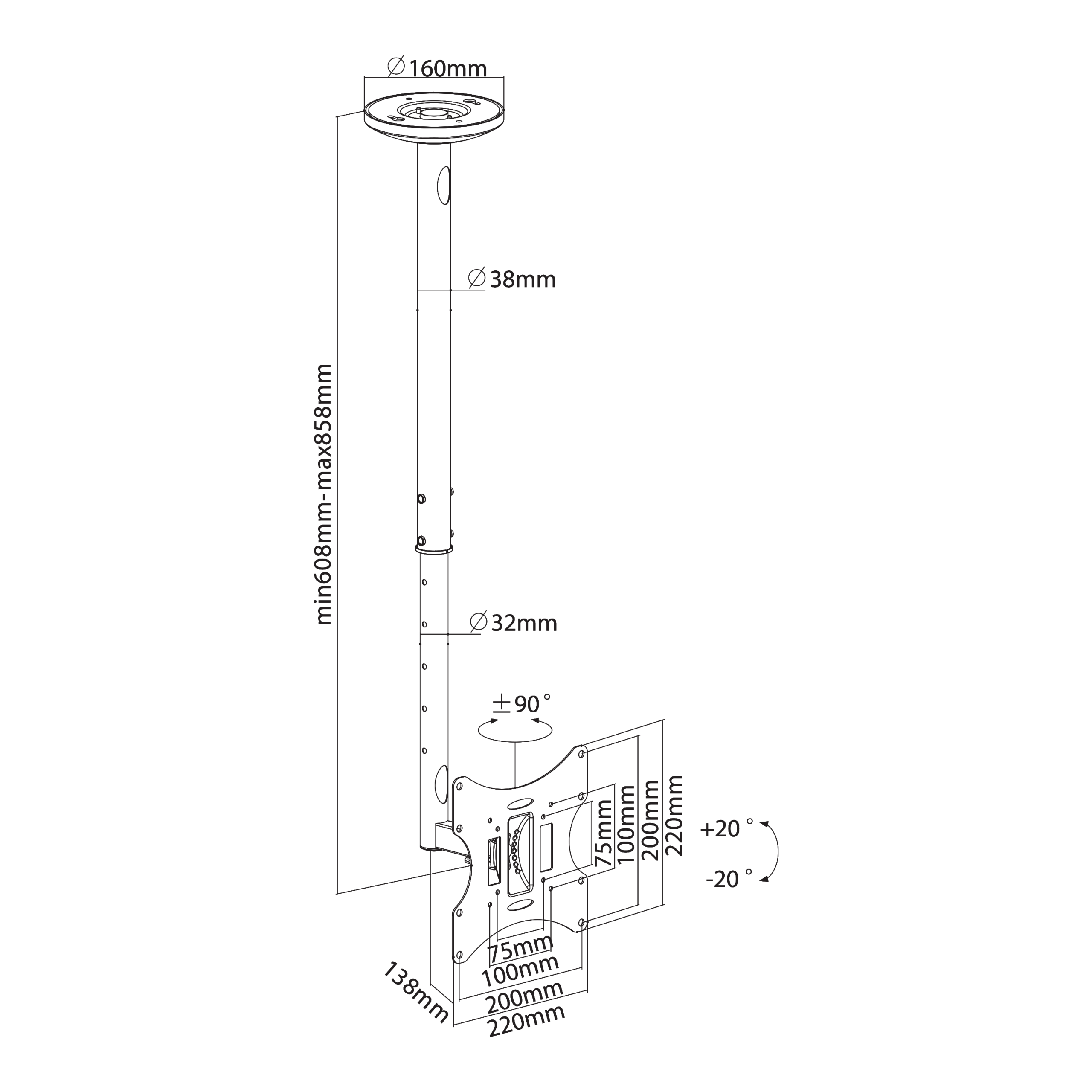 Podešavanje visine: 608 – 858 mm (od stropa do TV-a)