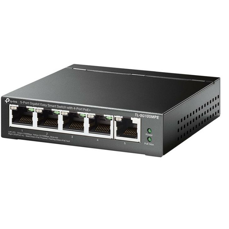 – Five 10/100/1000Mbps RJ45 ports – Equipped with four 802.3af/at PoE+ ports with up to 30W for each port, data, and power can be transferred on one single cable- Supports PoE power up to 120 W for all PoE ports*- Provides network monitoring, traffic prioritization, VLAN features, and PoE Auto Recovery- Simple network set-up on top of plug-and-play connectivity- Web-based user interface and Easy Smart Configuration Utility simplify configuration- Fanless design lowers energy consumption and eliminates operating noiseSpecificationsHARDWARE FEATURES- Standards and Protocols• IEEE 802.3i, IEEE 802.3u, IEEE 802.3ab, IEEE 802.3af,• IEEE 802.3x, IEEE 802.1q, IEEE 802.1p, IEEE 802.3at- Interface • Five 10/100/1000Mbps RJ45 Ports• AUTO Negotiation/AUTO MDI/MDIX- Network Media • 10BASE-T: UTP category 3, 4, 5 cable (maximum 100m)• EIA/TIA-568 100? STP (maximum 100m)• 100BASE-TX: UTP category 5, 5e cable (maximum 100m)• EIA/TIA-568 100? STP (maximum 100m)• 1000BASE-T: UTP category 5, 5e, 6 or above cable (maximum 100m)• EIA/TIA-568 100? STP (maximum 100m)- Fan Quantity: Fanless- Power Supply: External Power Adapter (Output: 53.5 VDC / 2.43 A)- PoE Ports (RJ45) • Standard: 802.3 af/at compliant• PoE Ports: Port 1- Port 4• PoE Power Budget: 120 W- Dimensions ( W x D x H ): 3.9 × 3.9 × 1.0 in (99.8 × 98 × 25 mm)- Max Power Consumption: • 4.34 W (220 V/50 Hz with no PD connected)• 137.01 W (110 V/50 Hz with 120 W PD connected)- Max Heat Dissipation • 14.8 BTU/h (with no PD connected)• 467.17 BTU/h (with 120 W PD connected)PERFORMANCE- Switching Capacity: 10 Gbps- Packet Forwarding Rate: 7.44 Mpps- MAC Address Table: 2 K- Packet Buffer Memory: 1 Mb- Jumbo Frame: 16 KBSOFTWARE FEATURES- Quality of Service • Support Port-Based/802.1p/DSCP priority• Support 4 priority queues• Rate Limit• Storm Control- L2 Features • IGMP Snooping V1/V2/V3• Static Link Aggregation• Port Mirroring• Cable Diagnostics• Loop Prevention• PoE Auto Recovery• Extend Mode- VLAN • Supports up to 32 VLANs simultaneously (out of 4K VLAN IDs)• MTU/Port/Tag VLAN- Management • Web-based GUI• Easy Smart Configuration Utility- Transmission Method: Store-And-ForwardOTHERS- Certification: FCC, CE, RoHS- Package Contents• TL-SG105MPE• Power Adapter• Installation Guide• Rubber Feet- System Requirements: Microsoft Windows for running Utility- Environment: Operating Temperature: 0?~40? (32?~104?)- Storage Temperature: -40?~70? (-40?~158?)- Operating Humidity: 10%~90%RH non-condensing- Storage Humidity: 5%~95%RH non-condensing
