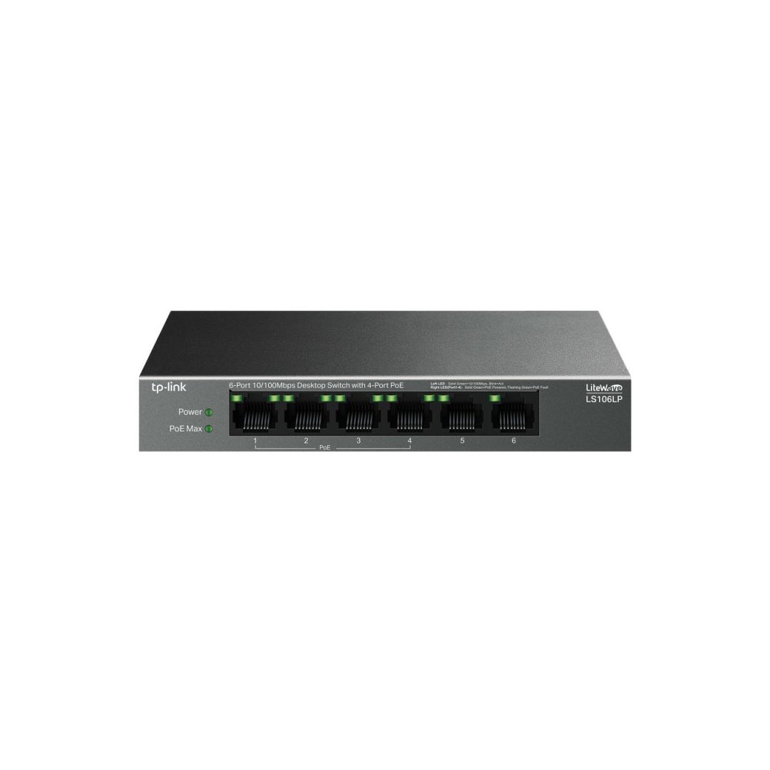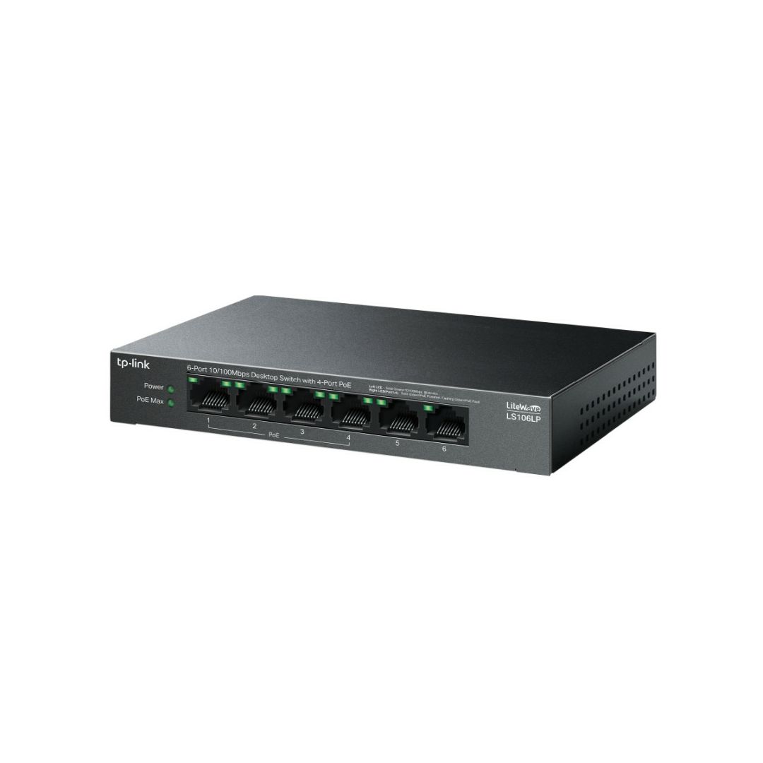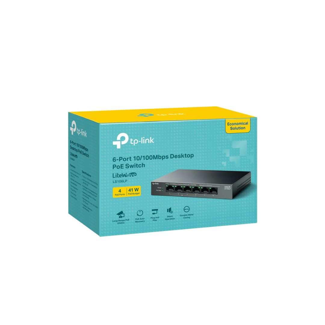 41 W PoE Budget: – Four 10/100 Mbps 802.3af-compliant PoE ports easily connect and power fixed devices like IP cameras, access points, and IP phones via a single cable. Up to 15.4 W PoE output is supported by each PoE port.*Up to 250 m PoE Transmission: – With Extend Mode, PoE transmission distance reaches up to 250m, perfect for surveillance camera deployment in large areas.**PoE Auto Recovery: – Automatically reboots your dropped or unresponsive PoE-powered devices.Plug and Play: – Simply plug and play for instant connectivity with no configuration required.Silent Operation: – Fanless design reduces power consumption and ensures silent operation, ideal for noise-sensitive homes or businesses.Reliable Hardware Design: – Durable metal casing and desktop/wall-mounting design are well-suited for different environments.SpecificationsHARDWARE FEATURES – Interface • 6× 10/100 Mbps RJ45 Ports (4× 10/100 Mbps 802.3af PoE Ports) • AUTO Negotiation • AUTO MDI/MDIX – Network Media • 10BASE-T: UTP category 3, 4, 5 cable (maximum 100m); EIA/TIA-568 100? STP (maximum 100m) • 100BASE-TX: UTP category 5, 5e cable (maximum 100m); EIA/TIA-568 100? STP (maximum 100m) – Fan Quantity: Fanless – Installation • Desktop • Wall Mounting – Power Supply: External Power Adapter (Output: 53.5VDC / 0.81A) – PoE Ports (RJ45) • Standard: 802.3 af compliant • PoE Ports: Ports 1–4, up to 15.4 W PoE output per port • Power Supply: 41 W – LED Indicator • Power • Link/Act • PoE Status • PoE MAX – Dimensions ( W x D x H ): 6.2×4.0×1.0 in (158×101×25 mm) – Max Power Consumption • 2.53 W (220 V/50 Hz no PD connected) • 47.76 W (220 V/50 Hz with 41 W PD connected) – Max Heat Dissipation • 8.61 BTU/h (220 V/50 Hz no PD connected) • 162.38 BTU/h (220 V/50 Hz with 41 W PD connected)PERFORMANCE – Switching Capacity: 1.2 Gbps – Packet Forwarding Rate: 0.8928 Mpps – MAC Address Table: 2K – Jumbo Frame: 2 KBSOFTWARE FEATURES – Advanced Features • Extend Mode Button (Ports 1–4, Up to 250 m PoE power supply and data transmission) • PoE Auto Recovery Button (Ports 1-4) • Compatible With IEEE 802.3af Compliant PDs • Mac Address Auto-Learning and Auto-Aging • IEEE 802.3x Flow Control • Green Technology – Transfer Method: Store and ForwardOTHERS – Certification: CE, FCC, RoHS – Package Contents • LS106LP • Power Adapter • Installation Guide – Environment • Operating Temperature: 0–40 ? (32–104 ?) • Storage Temperature: -40–70 ? (-40–158 ?) • Operating Humidity: 10–90% RH non-condensing • Storage Humidity: 5–90% RH non-condensing