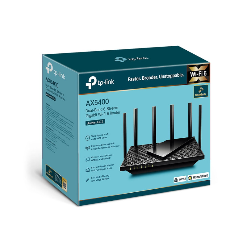 – Package Contents: Wi-Fi Router Archer AX72, Power Adapter, RJ45 Ethernet Cable, Quick Installation Guide