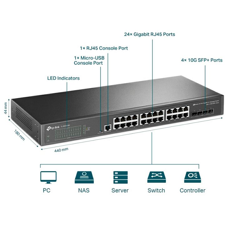 – 10G Lightning-Fast Uplink: 4× 10 Gbps SFP+ slots enable high-bandwidth connectivity and non-blocking switching capacity- Gigabit Speeds: 24× gigabit RJ45 ports offer high-speed and reliable connections to other switches and devices- Integrated into Omada SDN: Zero-Touch Provisioning (ZTP), Centralized Cloud Management, and Intelligent Monitoring- Centralized Management: Cloud access and Omada app for ultra convenience and easy management- Static Routing: Helps route internal traffic for more efficient use of network resources- Robust Security Strategies: IP-MAC-Port Binding, ACL, Port Security, DoS Defend, Storm control, DHCP Snooping, 802.1X, Radius Authentication, and more- Optimize Voice and Video Applications: L2/L3/L4 QoS and IGMP snooping- Standalone Management: Web, CLI (Console Port, Telnet, SSH), SNMP, RMON, and Dual Image bring powerful management capabilitiesSpecificationsHARDWARE FEATURES- Interface:* 24× 10/100/1000 Mbps RJ45 Ports* 4× 10G SFP+ Slots* 1× RJ45 Console Port* 1× Micro-USB Console Port- Fan Quantity: Fanless- Power Supply: 100-240V AC – 50/60 Hz- Dimensions (W×D×H): 440×180×44 mm- Mounting: Rack Mountable- Max Power Consumption: 23.6 W (110V/60Hz)- Max Heat Dissipation: 80.353 BTU/h (110 V/60 Hz)PERFORMANCE- Switching Capacity: 128 Gbps- Packet Forwarding Rate: 95.23 Mpps- MAC Address Table: 16 K- Jumbo Frame: 9 KBSOFTWARE FEATURES- Quality of Service:* 8 priority queues* 802.1p CoS/DSCP priority* Queue scheduling (SP (Strict Priority), WRR (Weighted Round Robin), SP+WRR)* Bandwidth Control (Port/Flow based Rating Limiting)* Smoother Performance* Action for Flows (Mirror (to supported interface), Redirect (to supported interface), Rate Limit, QoS Remark)- L2 and L2+ Features:* Link Aggregation (static link aggregation, 802.3ad LACP, Up to 8 aggregation groups, containing 8 ports per group)* Spanning Tree Protocol (802.1d STP, 802.1w RSTP, 802.1s MSTP, STP Security: TC Protect, BPDU Filter, Root Protect)* Loopback Detection (Port based, VLAN based)* Flow Control (802.3x Flow Control, HOL Blocking Prevention)* Mirroring (Port Mirroring, CPU Mirroring, One-to-One, Many-to-One, Tx/Rx/Both)- L2 Multicast:* IGMP Snooping (IGMP v1/v2/v3 Snooping, Fast Leave, IGMP Snooping Querier, IGMP Authentication)* IGMP Authentication* MLD Snooping (MLD v1/v2 Snooping, Fast Leave, MLD Snooping Querier, Static Group Config, Limited IP Multicast)* MVR* Multicast Filtering: 256 profiles and 16 entries per profile- VLAN:* VLAN Group (Max 4K VLAN Groups)* 802.1Q Tagged VLAN* MAC VLAN: 7 Entries* Protocol VLAN: Protocol Template 16, Protocol VLAN 16* Private VLAN* GVRP* VLAN VPN (QinQ) (Port-Based QinQ, Selective QinQ)* Voice VLAN- Access Control List:* Time-based ACL* MAC ACL (Source MAC, Destination MAC, VLAN ID, User Priority, Ether Type)* IP ACL (Source IP, Destination IP, Fragment, IP Protocol, TCP Flag, TCP/UDP Port, DSCP/IP TOS, User Priority)* Combined ACL* Packet Content ACL* IPv6 ACL* Policy (Mirroring, Redirect, Rate Limit, QoS Remark)* ACL apply to Port/VLAN- Security:* IP-MAC-Port Binding (512 Entries, DHCP Snooping, ARP Inspection, IPv4 Source Guard: 100 Entries)* IPv6-MAC-Port Binding (512 Entries, DHCPv6 Snooping, ND Detection, IPv6 Source Guard: 100 Entries)* DoS Defend* Static/Dynamic Port Security (Up to 64 MAC addresses per port)* Broadcast/Multicast/Unicast Storm Control (kbps/ratio control mode)* 802.1X (Port base authentication, Mac base authentication, VLAN Assignment, MAB, Guest VLAN, Support Radius authentication andaccountability)* AAA (including TACACS+)* Port Isolation* Secure web management through HTTPS with SSLv3/TLS 1.2* Secure Command Line Interface (CLI) management with SSHv1/SSHv2* IP/Port/MAC based access control- IPv6:* IPv6 Dual IPv4/IPv6* Multicast Listener Discovery (MLD) Snooping* IPv6 ACL* IPv6 Interface* Static IPv6 Routing* IPv6 neighbor discovery (ND)* Path maximum transmission unit (MTU) discovery* Internet Control Message Protocol (ICMP) version 6* TCPv6/UDPv6* IPv6 applications (DHCPv6 Client, Ping6, Tracert6, Telnet (v6), IPv6 SNMP, IPv6 SSH, IPv6 SSL, Http/Https, IPv6 TFTP)- L3 Features:* 16 IPv4/IPv6 Interfaces* Static Routing (48 static routes)* Static ARP (128 Static Entries)* Proxy ARP* Gratuitous ARP* DHCP Server* DHCP Relay (DHCP Interface Relay, DHCP VLAN Relay)* DHCP L2 Relay- Management:* Web-based GUI* Command Line Interface (CLI) through the console port, telnet* SNMP v1/v2c/v3 (Trap/Inform, RMON (1,2,3,9 groups))* SDM Template* DHCP/BOOTP Client* 802.1ab LLDP/LLDP-MED* DHCP AutoInstall* Dual Image, Dual Configuration* CPU Monitoring* Cable Diagnostics* EEE* Password Recovery* SNTP* System Log- Advanced Features:* Support Omada Hardware Controller (OC200/OC300), Software Controller, Cloud-Based Controller* Automatic Device Discovery* Batch Configuration* Batch Firmware Upgrading* Intelligent Network Monitoring* Abnormal Event Warnings* Unified Configuration* Reboot Schedule* ZTP (Zero-Touch Provisioning)- MIBs:* MIB II (RFC1213)* Interface MIB (RFC2233)* Ethernet Interface MIB (RFC1643)* Bridge MIB (RFC1493)* P/Q-Bridge MIB (RFC2674)* RMON MIB (RFC2819)* RMON2 MIB (RFC2021)* Radius Accounting Client MIB (RFC2620)* Radius Authentication Client MIB (RFC2618)* Remote Ping, Traceroute MIB (RFC2925)* Support TP-Link private MIBOTHERS- Certification: CE, FCC, RoHS- Package Contents: TL-SG3428X Switch, Power Cord, Quick Installation Guide, Rackmount Kit, Rubber Feet- Environment:* Operating Temperature: 0C to 45C (32F to 113F)* Storage Temperature: -40C to 70C (-40F to 158F)* Operating Humidity: 10% – 90% RH non-condensing* Storage Humidity: 5% – 90% RH non-condensing