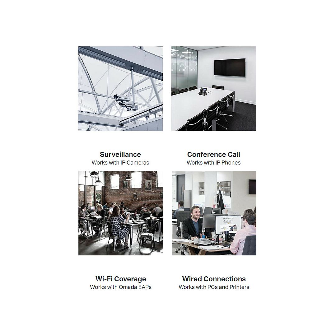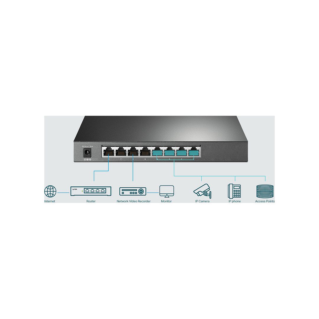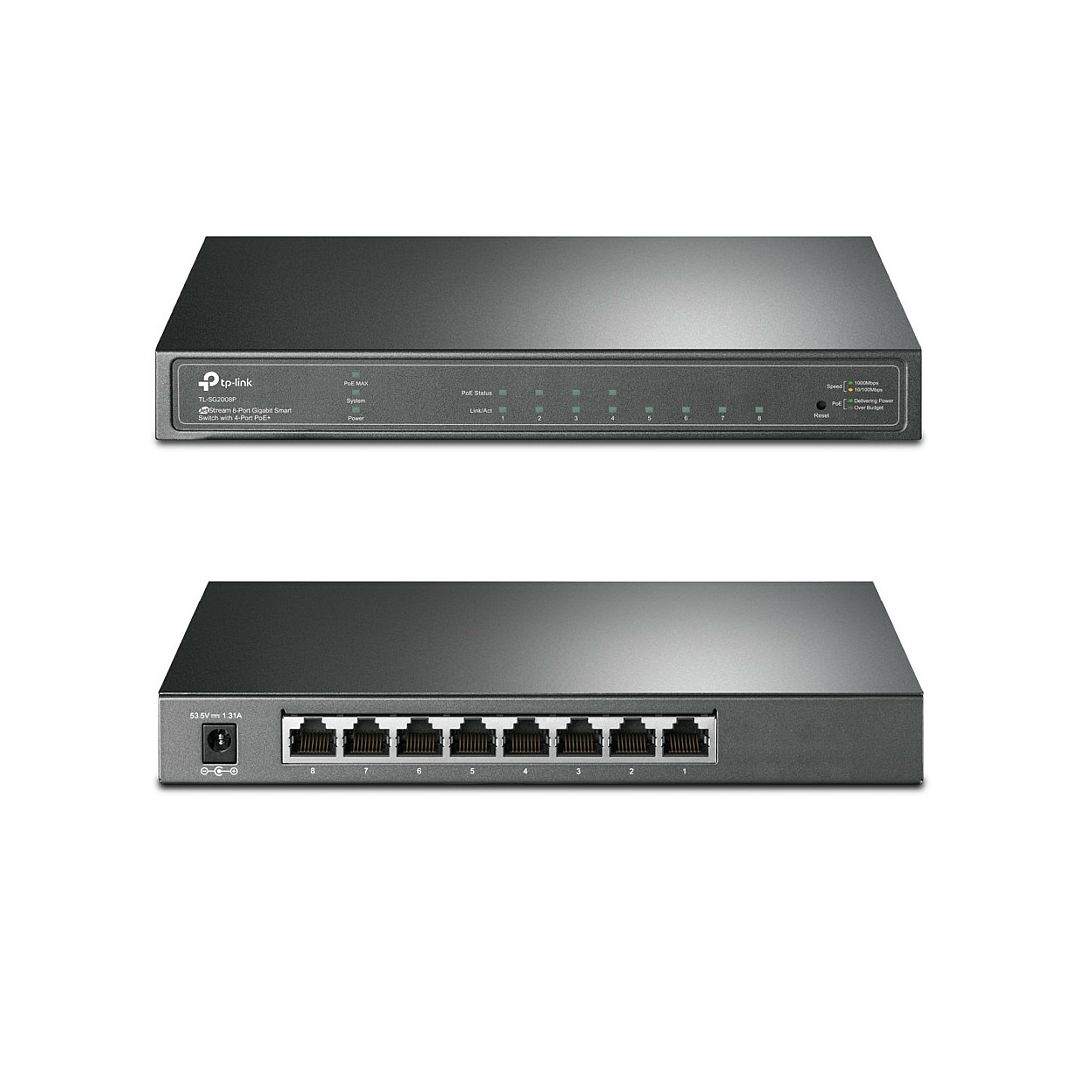 Features- 62W PoE Budget: 4× 802.3at/af-compliant PoE+ ports with a total power supply of 62W- Full Gigabit Ports: 4× gigabit PoE+ ports and 4× gigabit non-PoE ports provide high-speed connections- Integrated into Omada SDN: Centralized Cloud Management, and Intelligent Monitoring- Centralized Management: Cloud access and Omada app for ultra convenience and easy management- Robust Security Strategies: IP-MAC-Port Binding, ACL, Port Security, DoS Defend, Storm control, DHCP Snooping, 802.1X, Radius Authentication, and more- Optimize Voice and Video Applications: L2/L3/L4 QoS and IGMP snoopingSpecificationsHARDWARE FEATURES- Standards and Protocols: IEEE 802.3i, IEEE 802.3u, IEEE 802.3ab, IEEE 802.3ad, IEEE 802.3af, IEEE 802.3at, IEEE 802.3x, IEEE 802.1d, IEEE 802.1s, IEEE 802.1w, IEEE 802.1q, IEEE 802.1p, IEEE 802.1x- Interface:* 8× 10/100/1000 Mbps RJ45 Ports (Ports 1–4 Support 802.3at/af PoE+)* Auto-Negotiation/Auto MDI/MDIX- Network Media:* 10BASE-T: UTP category 3, 4, 5 cable (maximum 100m)* 100BASE-TX/1000Base-T: UTP category 5, 5e or above cable (maximum 100m)- Fan Quantity: Fanless- Power Supply: External Power Adapter (Output: 53.5 VDC/ 1.31 A)- Power Consumption:* 7.9 W (220 V/50 Hz) (no PD connected)* 79.2 W (220 V/50 Hz) (with 62 W PD connected)- PoE Ports (RJ45):* Standard: 802.3af/at compliant* PoE Ports: 4 Ports* Power Supply: 62 W*- Dimensions (W×D×H): 209×126×26 mmPERFORMANCE- Bandwidth/Backplane: 16 Gbps- MAC Address Table: 8k- Packet Buffer Memory: 4.1 Mbit- Jumbo Frame: 9 KBSOFTWARE FEATURES- Quality of Service:* 802.1p CoS/DSCP priority* 8 priority queues* Priority Schedule Mode: SP (Strict Priority), WRR (Weighted Round Robin)* Queue Weight Config* Bandwidth Control: Port/Flow-based Rating Limit* Smoother Performance* Storm Control: Multiple Control Modes(kbps/ratio), Broadcast/Multicast/Unknown-Unicast Control- L2 and L2+ Features:* DHCP Relay: DHCP VLAN Relay* DHCP L2 Relay* Link Aggregation: Static link aggregation, 802.3ad LACP, Up to 8 aggregation groups and up to 8 ports per group* Spanning Tree Protocol: 802.1D STP, 802.1w RSTP, 802.1s MSTP, STP Security: TC Protect, BPDU Filter/Protect, Root Protect* Loopback Detection* Flow Control: 802.3x Flow Control* Mirroring: Port Mirroring, CPU Mirroring, One-to-One, Many-to-One, Flow-Based, Ingress/Egress/Both* Device Link Detect Protocol (DLDP)* 802.1ab LLDP/ LLDP-MED- L2 Multicast:* 511 IPv4, IPv6 shared multicast groups* IGMP Snooping: IGMP v1/v2/v3 Snooping, Fast Leave, IGMP Snooping Querier, Static Group Config* Multicast VLAN Registration (MVR)* Multicast Filtering* MLD Snooping: MLD v1/v2 Snooping, Fast Leave, MLD Snooping Querier, Static Group Config* Limited IP Multicast (256 profiles and 16 entries per profile)- IPv6 Support:* IPv6 Dual IPv4/IPv6* Multicast Listener Discovery (MLD) Snooping* IPv6 neighbor discovery (ND)* Path maximum transmission unit (MTU) discovery* Internet Control Message Protocol (ICMP) version 6* TCPv6/UDPv6* IPv6 applications: DHCPv6 Client, Ping6, Tracert6, Telnet (v6), IPv6 SNMP, IPv6 SSH, IPv6 SSL, Http/Https, IPv6 TFTP- VLAN:* VLAN Group: Max. 4K VLAN Groups* 802.1Q tag VLAN* MAC VLAN* Protocol VLAN* GVRP* Voice VLAN- Access Control List:* Support up to 230 entries* Time-Range: Time Slice, Week Time-Range, Absolute Time-Range, Holiday* Time-based ACL* MAC ACL: Source MAC, Destination MAC, VLAN ID, User Priority, Ether Type* IP ACL: Source IP, Destination IP, IP Protocol, TCP Flag, TCP/UDP Source Port, TCP/UDP Destination Port, DSCP/IP TOS* IPv6 ACL* Combined ACL* Rule Operation: Permit/Deny* Policy Action: Mirror, Rate Limit, Redirect, QoS Remark* ACL Rules Binding: Port Binding, VLAN Binding* Actions for flows: Mirror (to supported interface), Redirect (to supported interface), Rate Limit, QoS Remark- Security:* AAA* 802.1X: Port-based authentication, MAC (Host) based authentication, Authentication Method includes PAP/EAP-MD5, MAB, Guest VLAN, Support Radius authentication and accountability* IP/IPv6-MAC Binding: 512 Binding Entries, DHCP Snooping, DHCPv6 Snooping, ARP Inspection, ND Detection* IP Source Guard: 253 Entries, Source IP+Source MAC* IPv6 Source Guard: 183 Entries, Source IPv6 Address+Source MAC* DoS Defend* Static/Dynamic/Permanent Port Security: Up to 64 MAC addresses per port* Broadcast/Multicast/Unicast Storm Control: kbps/ratio control mode* Port Isolation* Secure web management through HTTPS with SSLv3/TLS 1.2* Secure Command Line Interface (CLI) management with SSHv1/SSHv2* IP/Port/MAC-based access control- MIBs:* MIB II (RFC1213)* Bridge MIB (RFC1493)* P/Q-Bridge MIB (RFC2674)* Radius Accounting Client MIB (RFC2620)* Radius Authentication Client MIB (RFC2618)* Remote Ping, Traceroute MIB (RFC2925)* Support TP-Link private MIBs* RMON MIB(RFC1757, rmon 1,2,3,9)MANAGEMENT- Omada App: Yes- Centralized Management:* Omada Hardware Controller (OC300)* Omada Hardware Controller (OC200)* Omada Software Controller- Cloud Access: Yes (Through OC300, OC200, or Omada Software Controller)- Management Features:* Web-based GUI* Command Line Interface (CLI) through telnet* SNMPv1/v2c/v3* SNMP Trap/Inform* RMON (1,2,3,9 groups)* SDM Template* DHCP/BOOTP Client* Dual Image, Dual Configuration* CPU Monitoring* Cable Diagnostics* EEE* SNTP* System LogOTHERS- Certification: CE, FCC, RoHS- Package Contents: TL-SG2008P, Power Adapter, Installation Guide, Rubber Feet- System Requirements: Microsoft Windows 98SE, NT, 2000, XP, Vista or Windows 7/8/10, MAC OS, NetWare, UNIX or Linux- Environment:* Operating Temperature: 0C to 40 (32F to 104)* Storage Temperature: -40C to 70 (-40F to 158)* Operating Humidity: 10% – 90% RH non-condensing* Storage Humidity: 5% – 90% RH non-condensing