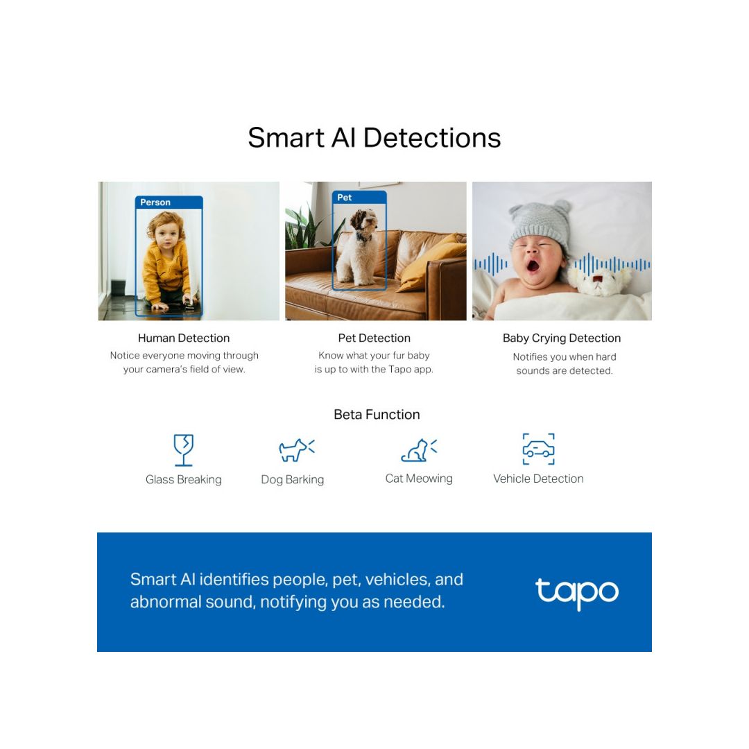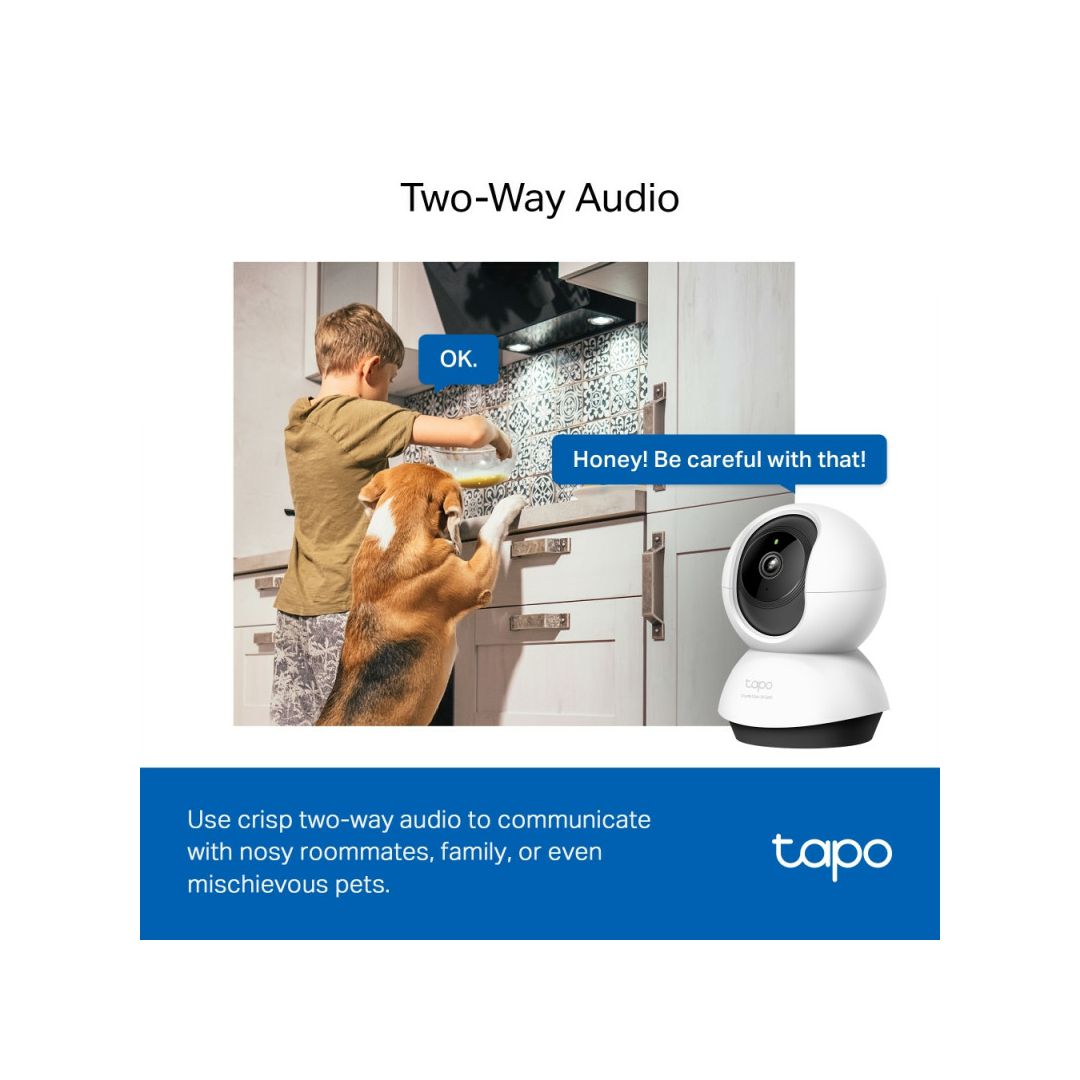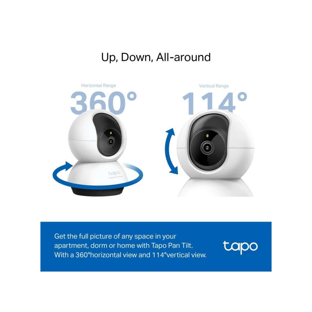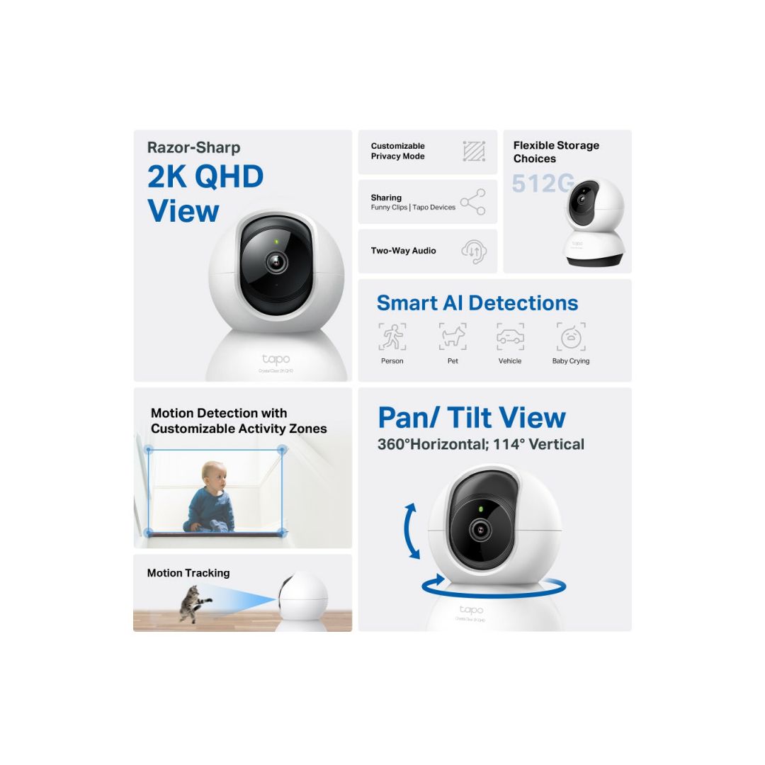 High-Quality Video Recording: – Capture every detail with exceptional clarity in 2K 4MP QHD resolution.Wide Range of Movement: – Enjoy a full 360o horizontal and 114o vertical range for pan and tilt, allowing you to cover more area.Enhanced Night Vision: – See clearly even in low-light conditions with advanced night vision that provides visibility up to 30 ft.Smart AI Detection and Notifications: – Benefit from smart AI technology that detects relevant events and sends you instant notifications.Sound and Light Alarm: – Scare away unwanted visitors using a sound and light alarm that triggers attention-grabbing effects.Two-Way Audio: – Enables communication through a built-in microphone and speakerSafe Storage: – Store footage directly on a microSD card with a capacity of up to 512 GB, ensuring safe and convenient storage.(microSD card purchased separately.)Hands-Free Operation: – Control the device using your voice with compatibility for Google Assistant and Amazon Alexa, freeing up your hands for other tasks. (Availability of Google Assistant and Amazon Alexa may vary based on language and country)SpecificationsCAMERA – Image Sensor: 1/3” – Lens * Focal Length: 4.0mm±5% * F/NO: 2.0±10% – Motion Range * Pan Mechanical Range: 340° (360° Pan Coverage) * Tilt Mechanical Range: 69° (110° Tilt Coverage) – Night Vision: 850nm IR LED Night Vision up to 30ft – Interface & Button * 1× RESET Button * 1× MicroSD Card Slot (Up to 512GB) – Pan/Tilt Range * 360° Horizontal * 114° Vertical – Resolution: 2K 4MP QHD (2560 * 1440 px)VIDEO & AUDIO – Maximum Resolution * 1× RESET Button * 1× MicroSD Card Slot (Up to 512GB) * Frame Rate: 15/20/25/30 fps (Default 15fps) – Digital Zoom: 12x – Video Compression: H.264 – Live View: Yes – Image Enhancement: * 3D DNR * BLC – Audio Input & Output: Built-in Microphone and Speaker – Audio Communication: Two-Way Audio with Noise Cancellation – Siren Volume: 99dB (Level measured at 4-inch/10-cm distance)STORAGE – Local Storage: MicroSD Card Slot on Camera (Up to 512 GB) – Cloud Storage: Tapo Care Cloud Storage Services (Subscription required)VIDEO – Frame Rate: 2560×1440 30fps – Video Compression: H.264DETECTION and NOTIFICATIONS – AI Detection * Motion Detection * Person Detection * Line-Crossing Detection * Tamper Detection * BabyCry Detection * Vehicle Detection * Pet Detection * Meow Detection * Bark Detection * Glass-Breaking Detection – Activity Zones: Yes – Output Notification * System Notification * System Notification with Snapshot (Tapo Care Services)AUDIO – Audio Communication: Two-Way Audio – Audio Input & Output: Built-in microphone and speakerNETWORK – Network Connectivity: Connect via Wi-Fi – Wireless Connectivity: IEEE 802.11b/g/n/ax, 2.4 GHz Wi-Fi – Protocol: TCP/IP, DHCP, ICMP, DNS, NTP, HTTPS, TCP, UDP – Wireless Rate * 11Mbps(802.11b) * 54Mbps(802.11g) * 72.2Mbps(802.11n) – RTSP: Yes – ONVIF: Supported – Cloud: Supported – Security: 128 bit AES encryption with SSL/TLSSECURITY – Security * On-Device Machine Learning * 128-bit AES Encryption with SSL/TLS * WPA/WPA2-PSKPOWER – Power Source: 9V DC Power Adapter – Input Voltage: 100-240 V, 50/60 Hz – Output Voltage: 9V, 0.6 A (DC Power) – Camera input: 3 Meter Power CableGENERAL – Smart Integration: Google Assistant, Amazon Alexa – Mounting Options: * Tabletop * Ceiling-Mounted – Operating Temperature: 0 C-40 C – Storage Temperature: -20 C-70 C – Operating Humidity: 10%-90% RH, Non-condensing – Storage Humidity: 5%-90% RH, Non-condensing – Dimensions: 3.36 × 3.42 × 4.63 in (85.4 × 86.8 × 117.7 mm)Package Contents * Tapo C220 Camera * Power Adapter * Quick Start Guide * Mounting Screws * Mounting Anchors * Mounting Template * Camera Base – Certifications: CE, FCC, RCM, WEEE, EAC