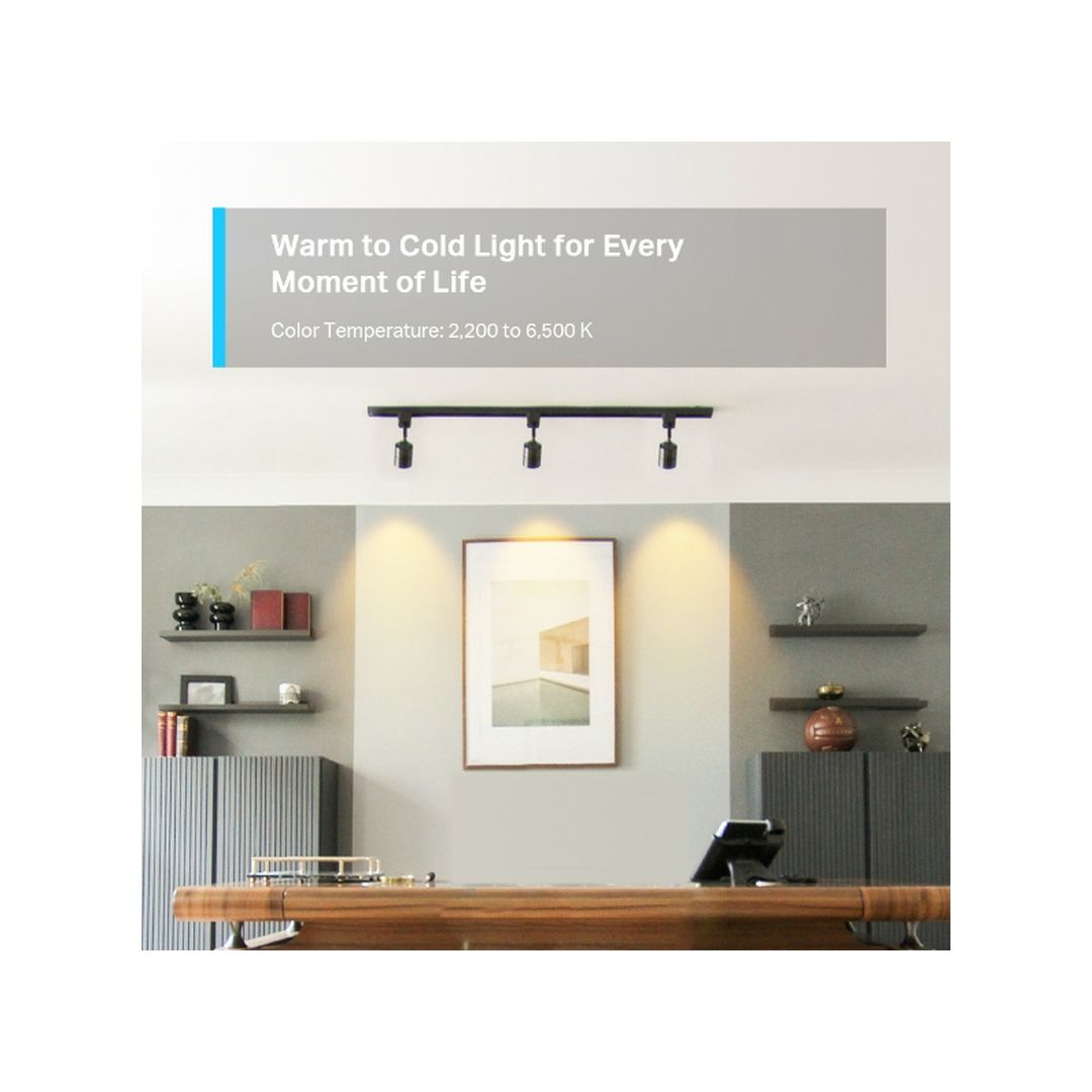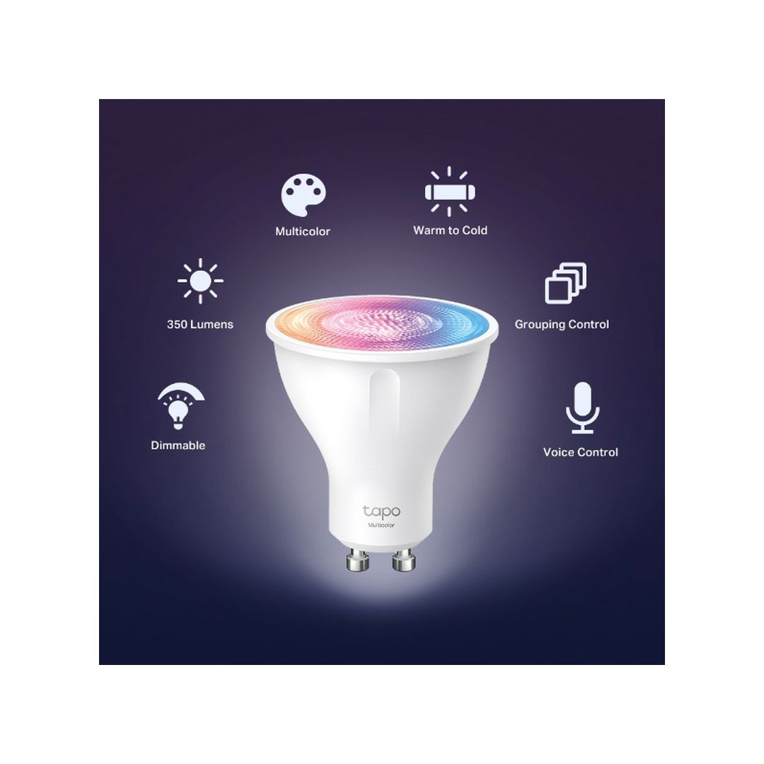 16 Million Colors – Shape the amazing vibe by picking the lights from a wide array of colors, even dim to any brightness you desire for the perfect atmosphere.White Tunable – Adjust the color temperature from 2,200 K to 6,500 K based on your changing needs.High Lumen & Dimmable- Emits 350 lm light that is bright enough to shed lights on any object and could be dimmed from 1% to 100%.GU10 Lamp Base – Compatible with any GU10 fixtures well. No extra burden for your first attempt.Grouping – Control all the Tapo Smart Spotlights by just one click on App.Energy Saving – Reduce energy use by operating energy savingly, without losing brightness or quality.Remote Control – Instantly turn the spotlight on/off wherever you are via the Tapo App.Schedule – Preset a fixed schedule to manage your smart devices automatically.Timer – Create countdown timer lists for more precise time control.Voice Control – Manage your smart spotlights with voice commands via Amazon Alexa or Google Assistant.Easy Setup and Use – No hub required, set up quickly and manage easily through the free App.SpecificationsNETWORK- Wi-Fi Protocol: IEEE 802.11 b/g/n- Wi-Fi Frequency: 2.4 GHzGENERAL- Operating Temperature: 0 oC~ 40 oC- Operating Humidity: 10%~90%RH, Non-condensing- Weight: 55 g (package included)- Package Contents: • Tapo Smart Spotlight• Quick Start Guide- Lamp Base: GU10 fitting- Product Dimensions: D50 x 55.2 mm- Certifications: CE, ERP, RoHS, RCMTECHNICAL SPECIFICATIONS- Form Factor: GU10- Brightness: 350 Lumens (50 W Equivalent)- Dimmable: Yes (via app and voice only)- Light Beam Angle: 40°- SDCM: – Switching Cycles: 15,000- Lifetime: 15,000 Hrs- Weighted Energy Consumption: 4 kWh/1,000 h- Energy Class: E- Voltage: 220-240 V, 50/60 Hz- Colour Temperature: 2,200-6,500 K- Warm-up Time up to 95%: ?1 s- Colour Rendering Index: ? 80- Wattage: 3.7 W- Standby Power: 0.2 W