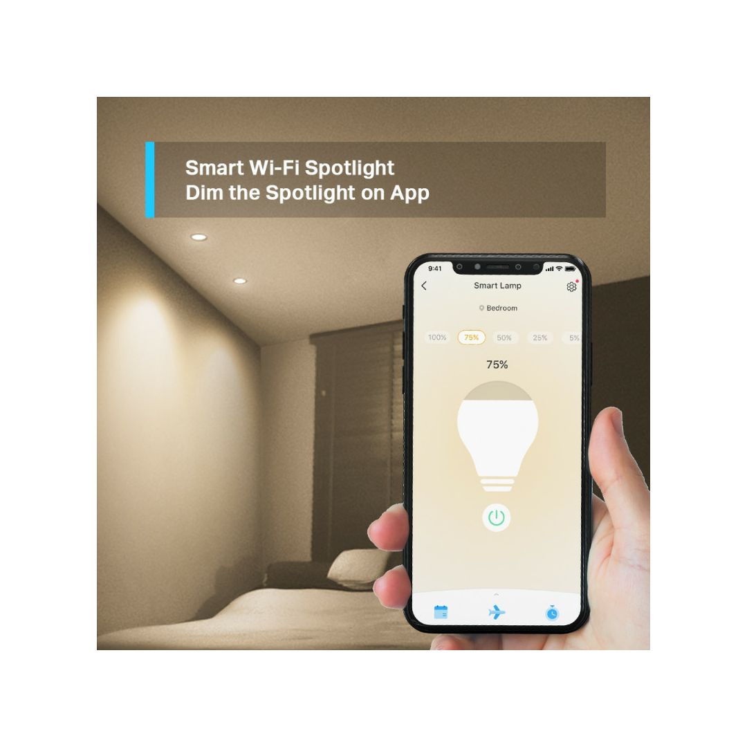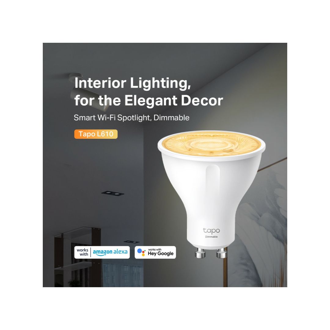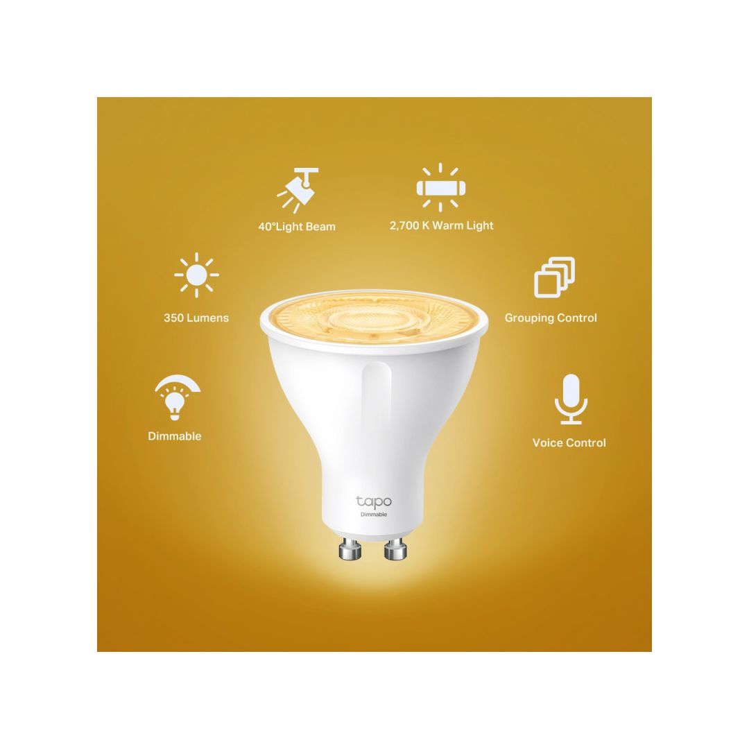 2,700 K Warm Light – Set off a cozy and comfortable vibe for your home or any other public space1~100% Dimmable – Dim to any brightness you desire for constantly-changing needs.High Lumen – Emits 350 lm light that is bright enough to shed light on any objectGU10 Lamp Base – Compatible with any GU10 fixtures well. No extra burden for your first attempt.Grouping – Control all the Tapo Smart Spotlights by just one click on AppEnergy Saving – Reduce energy use by operating energy savingly, without losing brightness or quality.Remote Control – Instantly turn the spotlight on/off wherever you are via the Tapo App.Schedule – Preset a fixed schedule to manage your smart devices automatically.Timer – Create countdown timer lists for more precise time control.Voice Control – Manage your Smart Spotlights with voice commands via Amazon Alexa or Google Assistant.Easy Setup & Use – No hub required, set up quickly and manage easily through the free App.SpecificationsNETWORK – Wi-Fi Protocol: IEEE 802.11 b/g/n – Wi-Fi Frequency: 2.4 GHzGENERAL – Operating Temperature: 0 C- 40 C – Operating Humidity: 10%- 90 RH, Non-condensing – Weight 51 g (package included) – Package Contents – Tapo Smart Spotlight ×4 – Quick Start Guide – Lamp Base: GU10 fitting – Product Dimensions: D50 x 55.2 mm – Certifications: CE, ERP, RoHS, RCMTECHNICAL SPECIFICATIONS – Form Factor: GU10 – Brightness: 350 Lumens (50 W Equivalent) – Dimmable: Yes (via app and voice only) – Light Beam Angle: 40° – SDCM: – Switching Cycles: 15,000 – Lifetime: 15,000 Hrs – Weighted Energy Consumption: 3 kWh/1,000 h – Energy Class: D – Voltage: 220-240 V, 50/60 Hz – Colour Temperature: 2,700 K – Warm-up Time up to 95%: 1 s – Colour Rendering Index: 80 – Wattage: 2.9 W – Standby Power: 0.2 W