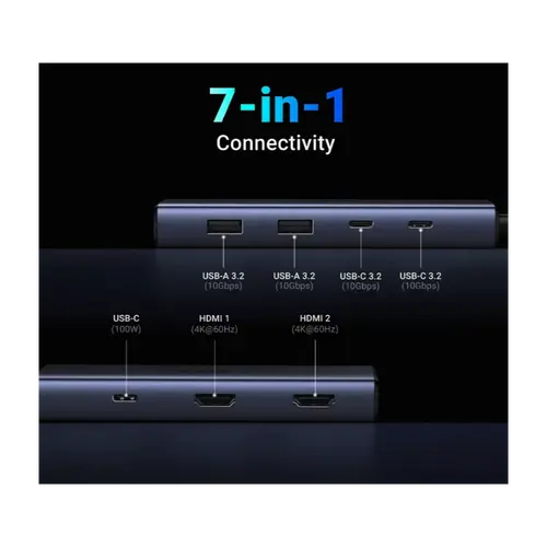 USB C razdjelnik sa 7 priključaka: 7-u-1 USB C čvorište pretvara jedan USB-C priključak vašeg prijenosnika u 2 HDMI priključka (4K@60 Hz), 2 USB-C 3.2 (10 Gbps), 2 USB-A 3.2 (10 Gbps) te 1 USB-C PD ulaz za napajanje do 100 W. Savršeno rješenje za istovremeno povezivanje više monitora, perifernih uređaja i punjenje prijenosnika – sve kroz jedan priključak.