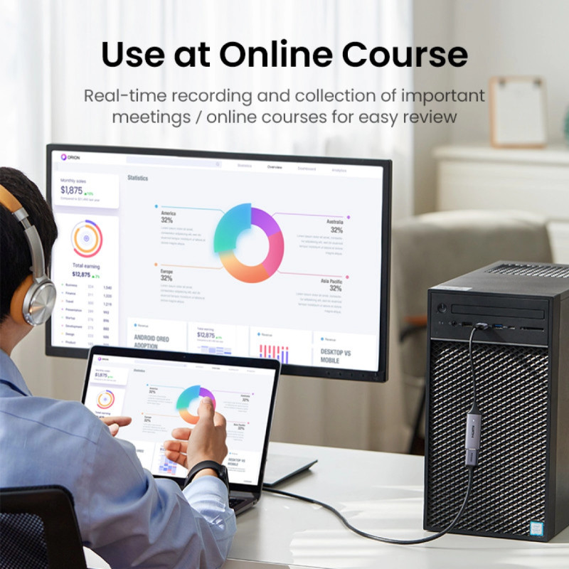 – Ugreen 40189 HDMI na USB 2.0 / Type-C video snimač je uređaj koji podržava snimanje i streaming vaših slika i videa s uređaja kao što su računala, igraće konzole, Android uređaji, DVD playeri, Xbox,… Podržava HDMI ulaznu rezoluciju slike do 4K@60Hz, a USB A/C ulaz je 1080P/30Hz.