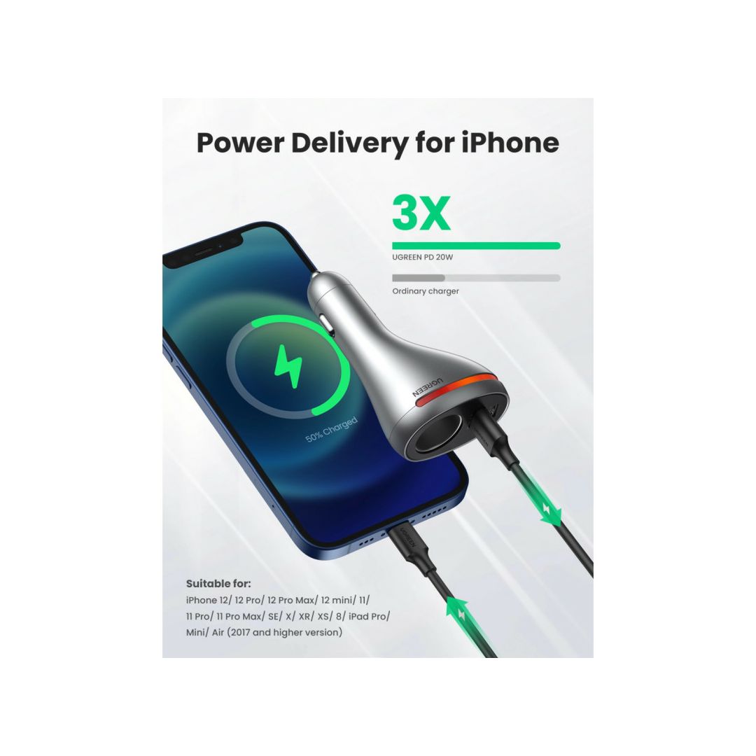 Ugreen jaki razdjelnik za upaljač od 84 W: – Vaš automobilski upaljač iz jednog priključka za punjenje prebacuje se na 60 W DC 12 V/24 V utičnicu i istovremeno na 20 W USB C priključak i 18 W brzi punjač 3.0 priključak. Ovaj auto USB adapter prikladan je za vaše razne zahtjeve za brzim punjenjem.Izvrstan dizajn za bolja rješenja punjenja: – USB utičnica za automobil s izlaznom snagom od 60 W DC 12 V/24 V za ispunjavanje zahtjeva za punjenje većine automobilskih uređaja. Savršeno pristaje uz vaš GPS, Dash Cam, SatNav, grijanje sjedala, rashladnu kutiju, ručni usisivač i tako dalje. Unutarnja Smart IC tehnologija inteligentno otkriva vaše uređaje za isporuku optimalne struje.Dual QC3.0 i PD 3.0, ukupna snaga od 24 W: – USB-C priključak od 20 W s Power Delivery 3.0 napunite svoj iPhone 13 do 88% u samo 1 sat. USB-A priključak 18W s Quick Charge 3.0 puni vaš Xiaomi 9 do 96% u samo 1 sat. Punite 2 porta istovremeno s ukupno 5 V/2,4 A.Široka kompatibilnost: – UGREEN auto adapter za upaljač USB C podržava napajanje, brzo punjenje 3.0, AFC, FCP, PSS brzo punjenje. USB-C priključak (PD3.0, PPS): kompatibilan s iPhone 13, iPhone 12, 11, XS Max, XR, XS, X, 8 Plus, iPad Pro M1, Galaxy S21, S20, A52, Xiaomi Note 10, Mix3, Mi9, Mi8 itd. USB-A priključak (QC3.0, FCP, AFC): kompatibilan s Galaxy Note 9, Note 8, S10, S10, S10+, A8, A0, A70, A50, A40; Huawei Mate 20 lite, P30 lite, P20 lite itd.Sigurnost je na prvom mjestu: – Ovaj USB upaljač za automobil dizajniran je s pametnim višestrukim zaštitnim čipom, tako da su vaši uređaji zaštićeni od oštećenja tijekom punjenja kao što su pregrijavanje, kratki spoj, prenapon i ne brinite o stabilnosti brzog punjenja.Specifikacije – Ukupna izlazna snaga: 12V/84W ili 24V/144W max – Produžna utičnica za upaljač za cigarete: 60 W max – USB C priključak: 20 W max – USB A priključak: 18 W max – Istovremena upotreba USB C i USB A priključaka: ukupna izlazna snaga je 24 W