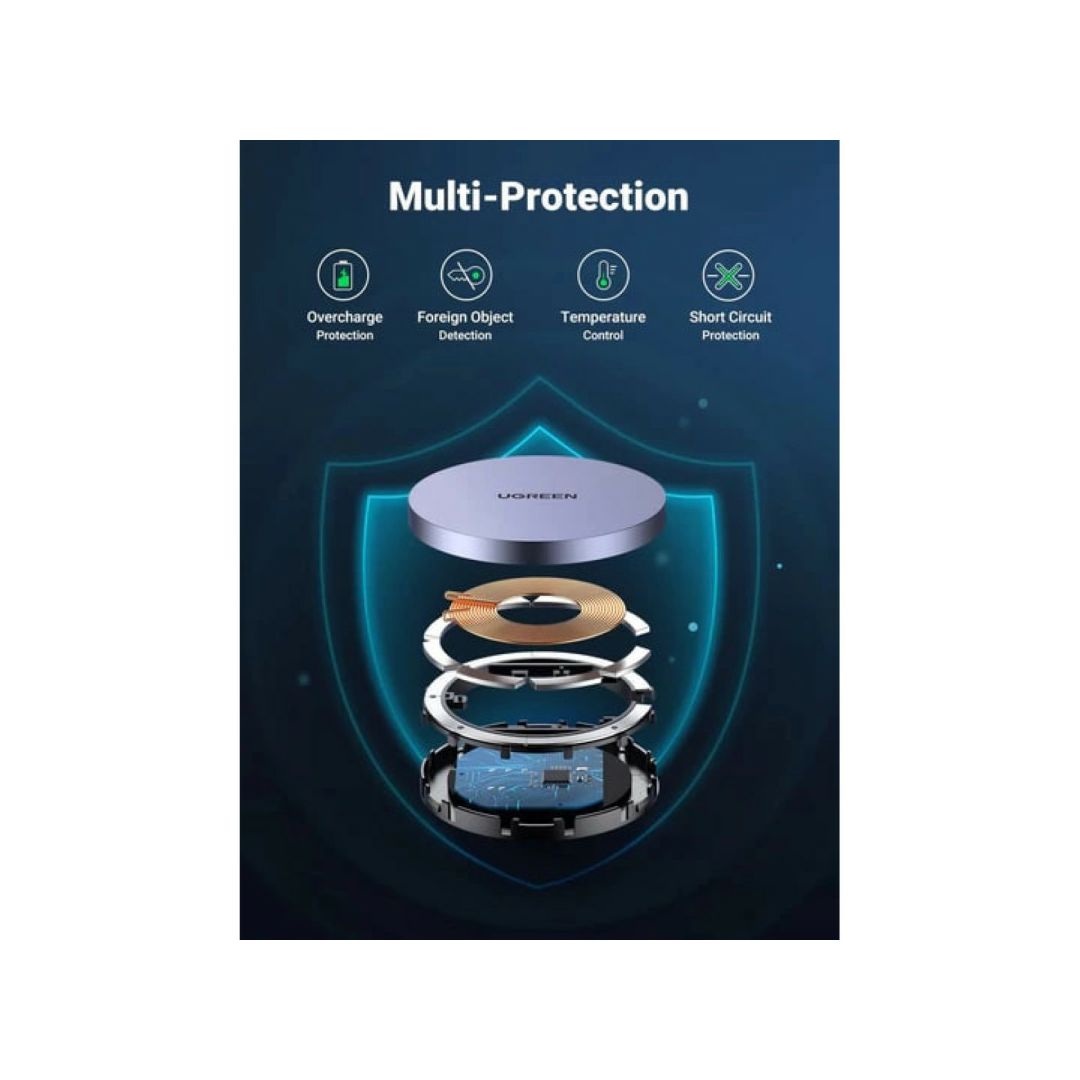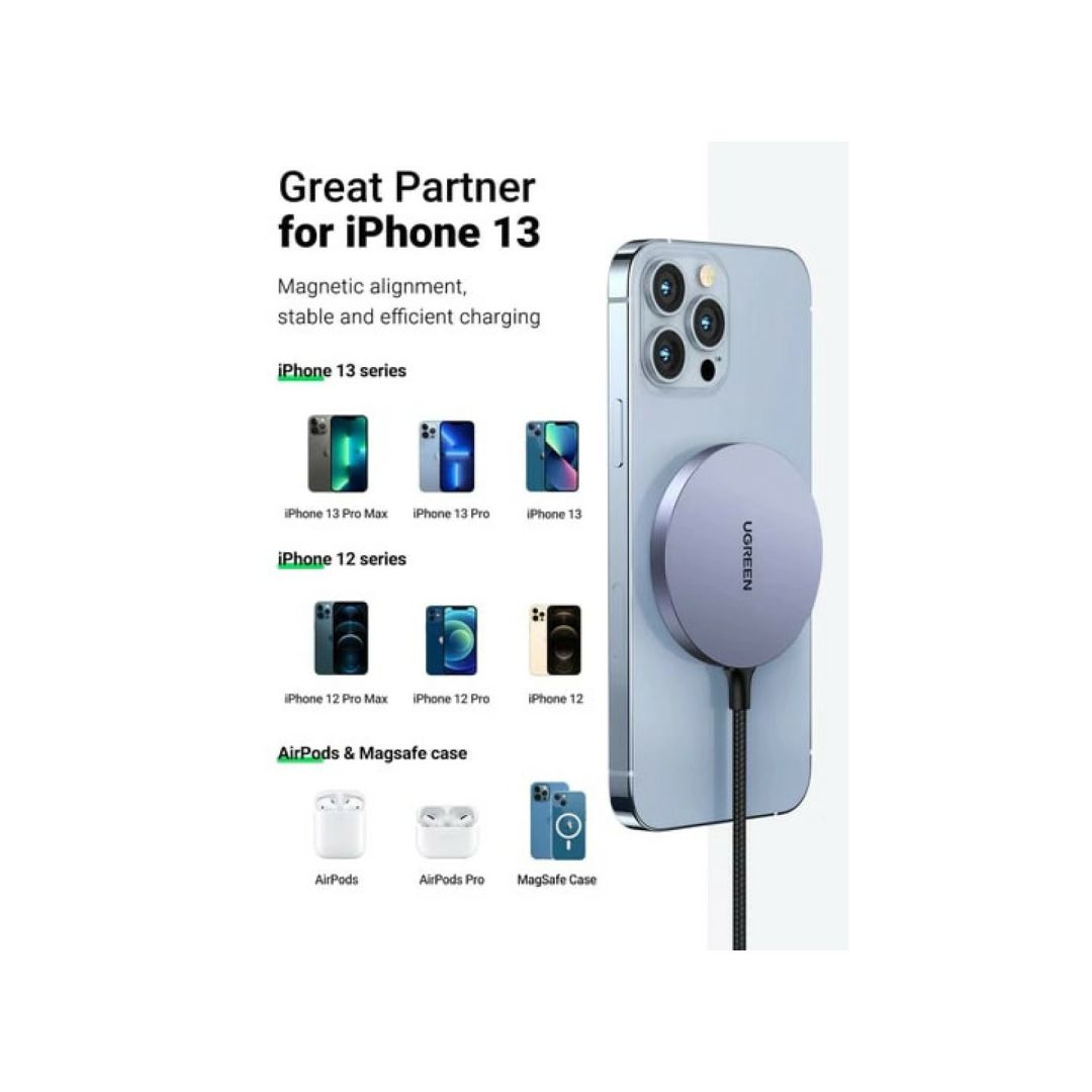 Magnetsko punjenje: – UGREEN magnetski bežični punjač s savršeno raspoređenim magnetima pričvršćuje se na vaš iPhone 14/14 Pro/14 Pro Max/13/13 Pro/13 Pro Max/13 Mini/12/12 Pro/12 Pro Max/12 Mini i osigurava brže bežično punjenje. Uređaj možete jednostavno postaviti na slobodne položaje, a bežični punjač će ubrzati vaš iPhone.Univerzalna kompatibilnost: – Dizajn za iPhone 14/14 Pro/14 Pro Max/13/13 Pro/13 Pro Max/13 Mini/12/12 Pro/12 Pro Max/12 Mini i AirPodsVisokokvalitetna maska: – Izvrsno mat kućište od aluminijske legure poboljšava odvođenje topline, a svemirsko siva boja savršeno se slaže s iPhone serijom. Visokokvalitetni i izdržljivi najlonski pleteni kabel za punjenje prošao je test savijanja 15.000 putaSiguran i pouzdan: – Magnetski bežični punjač opremljen je visokokvalitetnom metalnom pločom i vatrootpornim PC poklopcem, plus inteligentnim čipom za zaštitu od kratkih spojeva, prenapona, pregrijavanja i prekomjerne strujeMali i lagan: – Debljina ovog bežičnog punjača je samo 6 mm, tako da ga je lako nositi vani. Izvrstan je za korištenje u automobilu ili za nošenje u torbi za putovanjaSpecifikacije – Ulaz: 5V=2A 9V=2A 12V=2A – Izlazna snaga: maksimalno 15 W – Izlaz za iOS uređaje: 7,5 W – QI podrška – Udaljenost senzora (na kućištu): 5 mm Za optimalne performanse preporučujemo korištenje originalnih Apple futrola s MagSafeom ili futrole kompatibilne s MagSafeom – LED indikator – FCC, CE certifikat – Kabel za punjenje 1M uključen