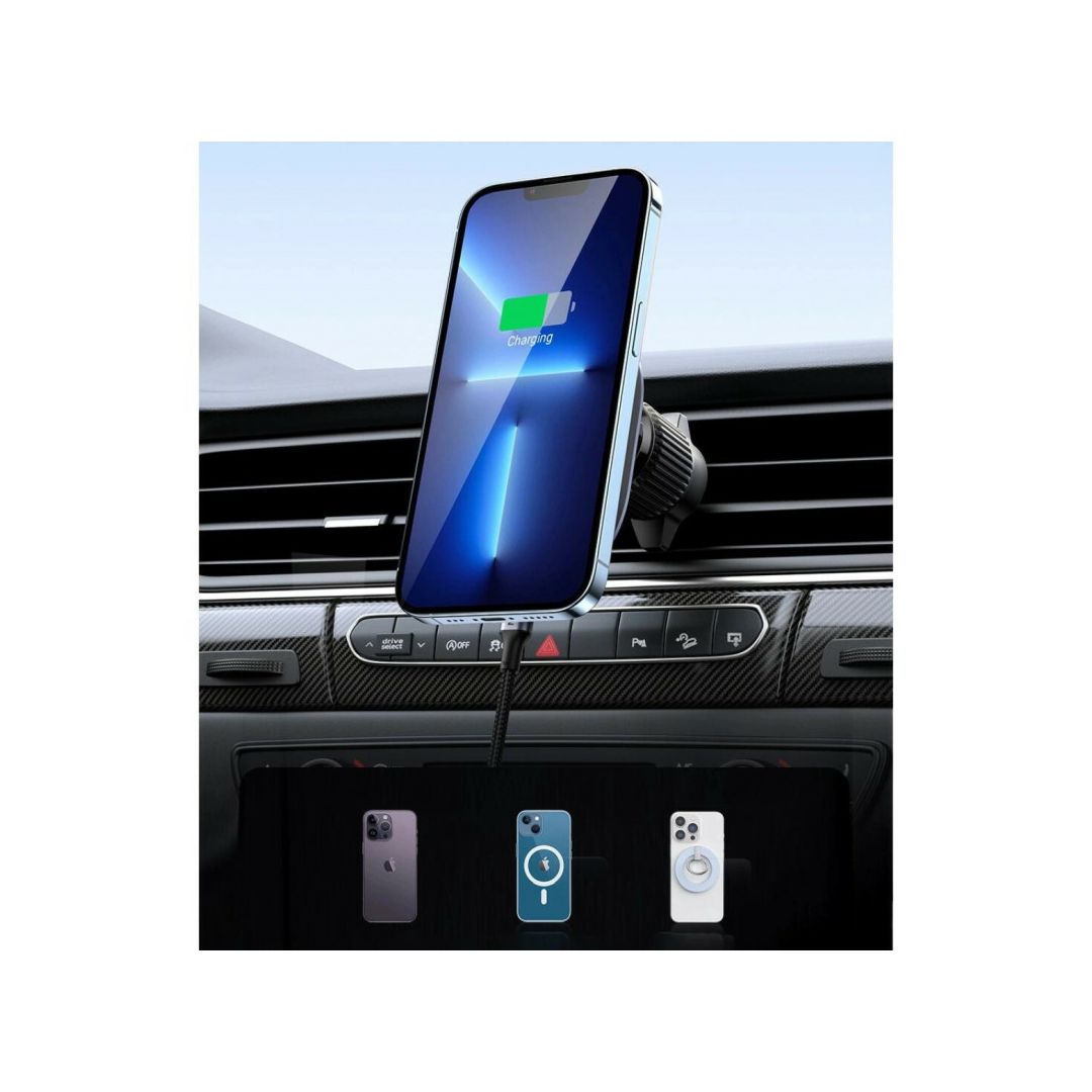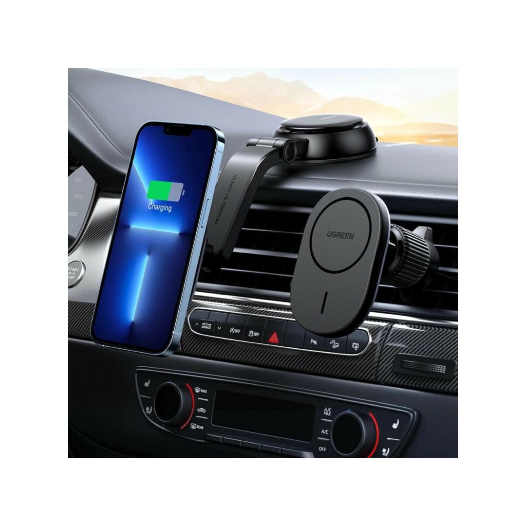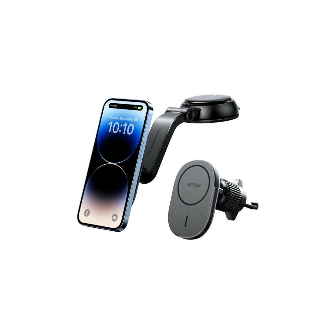 – MagSafe Ugreen CD345 2-u-1 indukcijski auto punjač za kokpit/prozor/rešetku – crni – Automobilski držač s ugrađenim MagSafe/Qi bežičnim punjačem je dodatak dizajniran za postavljanje na armaturnu ploču, vjetrobransko staklo ili ventilacijsku rešetku automobila. Dizajniran je na način da jamči potpunu sigurnost opreme koja se na njega nalazi. Proizvod je izuzetno jednostavan za korištenje. Samo stavite telefon na njega i ugrađeni magnet će ga automatski poravnati s držačem. Sve je izrađeno od visokokvalitetnih materijala (ABS + PC) i dizajnirano za Apple pametne telefone s MagSafe sustavom.Specifikacije – Boja: Crna – Mjesto ugradnje: instrumentna ploča, ventilacijska rešetka, vjetrobransko staklo – Izlazna snaga: 7,5 W / 15 W – Ulazna snaga: USB-C – Kompatibilnost: iPhone 12 i noviji – Materijal: PC+ABS