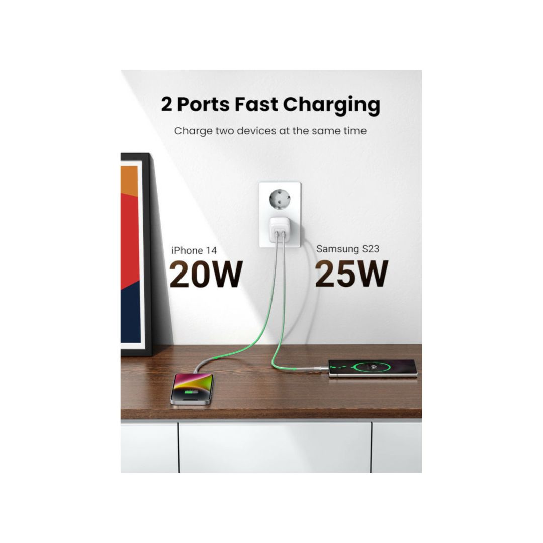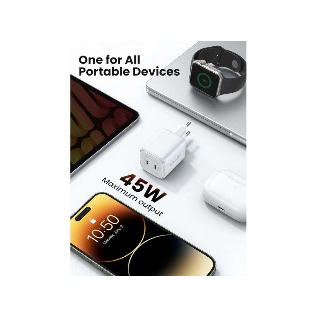 UGREEN Nexode Mini zidni punjač 45W, 2xUSB-C, GaN II Tech, QC 4.0, PD3.0, bijeli