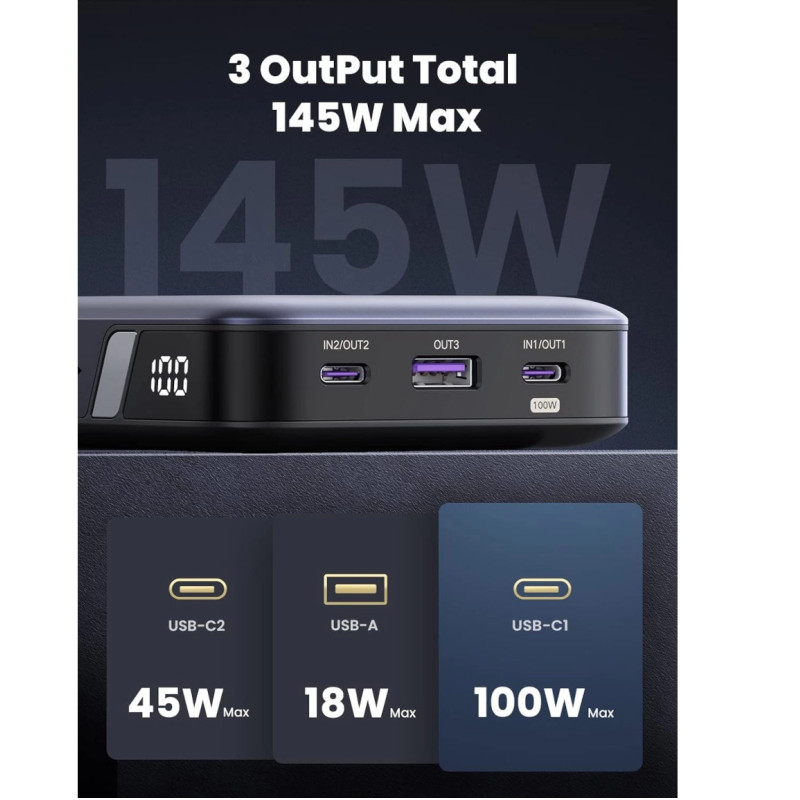 – Zahvaljujući najnovijim tehnologijama PD 3.0 i QC 3.0, ova prijenosna powerbanka može postići super brzu brzinu punjenja – ukupna snaga 145 W (USB C1 100 W + USB C2 45 W)! MacBook Pro 2022 može se napuniti do 50% za samo 30 minuta.