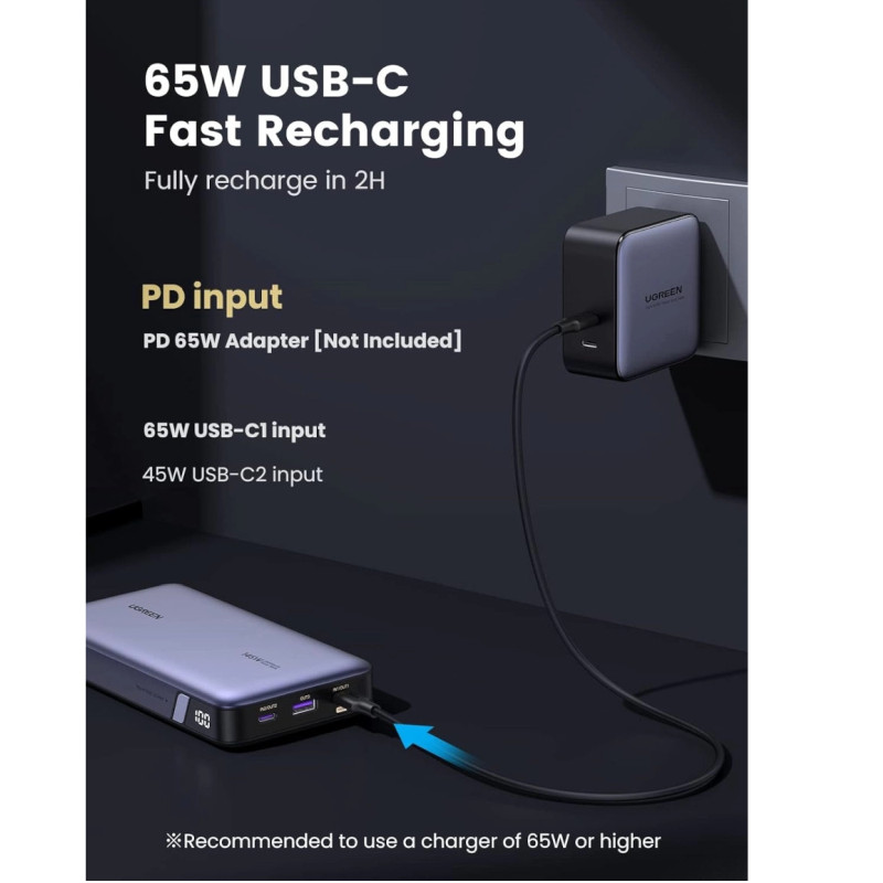 – UGREEN prijenosna baterija s brzim punjenjem može se u potpunosti napuniti za samo 2 sata pomoću adaptera od 65 W, 5 puta brže od običnih prijenosnih baterija. Ne morate čekati cijelu noć.