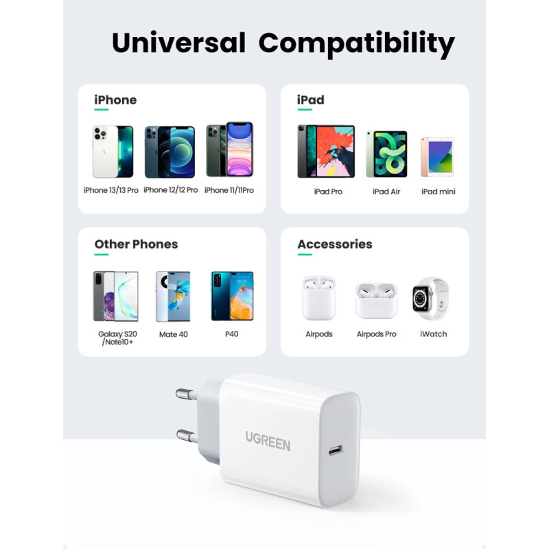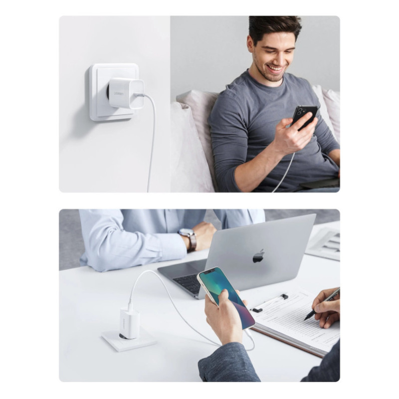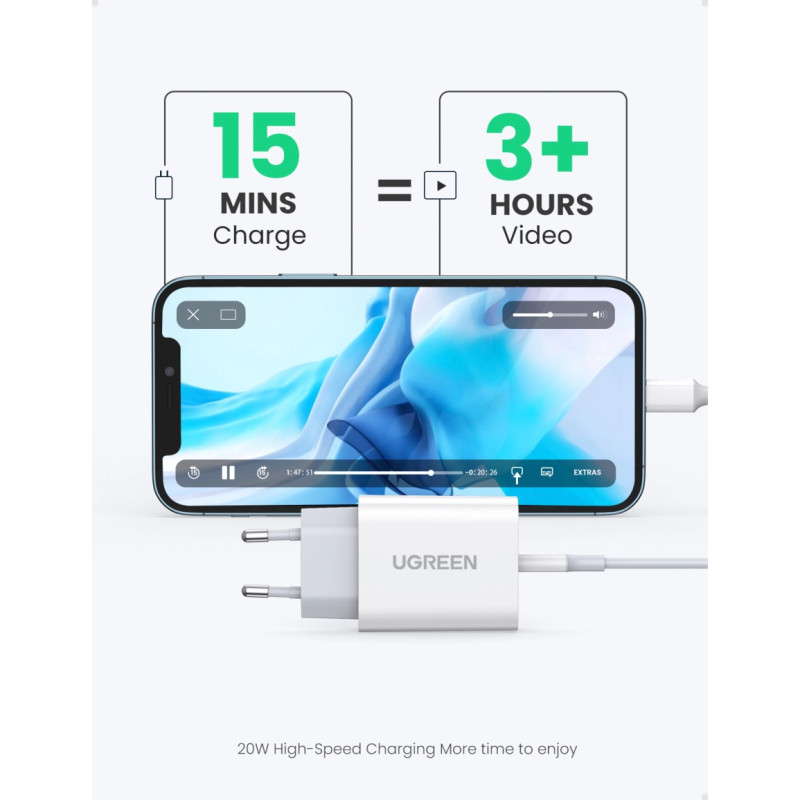 – UGREEN 20 W USB C punjač s MFi kabelom može napuniti vaš uređaj poput iPhonea 14 od 0% do 60% za samo 30 minuta. Puni se bez poruke o pogrešci. Ovo je 3 puta brže od uobičajenog adaptera za punjenje.