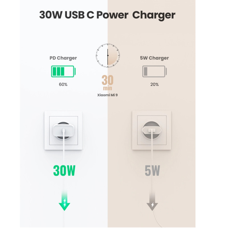 – Opremljen Type-C priključkom, UGREEN PD 3.0 punjač pruža maksimalnu izlaznu snagu od 30W za brzo punjenje Apple telefona, iPada, prijenosnih računala i svih USB-C uređaja. Napunite iPhone Xs do 50% za samo 30 minuta.