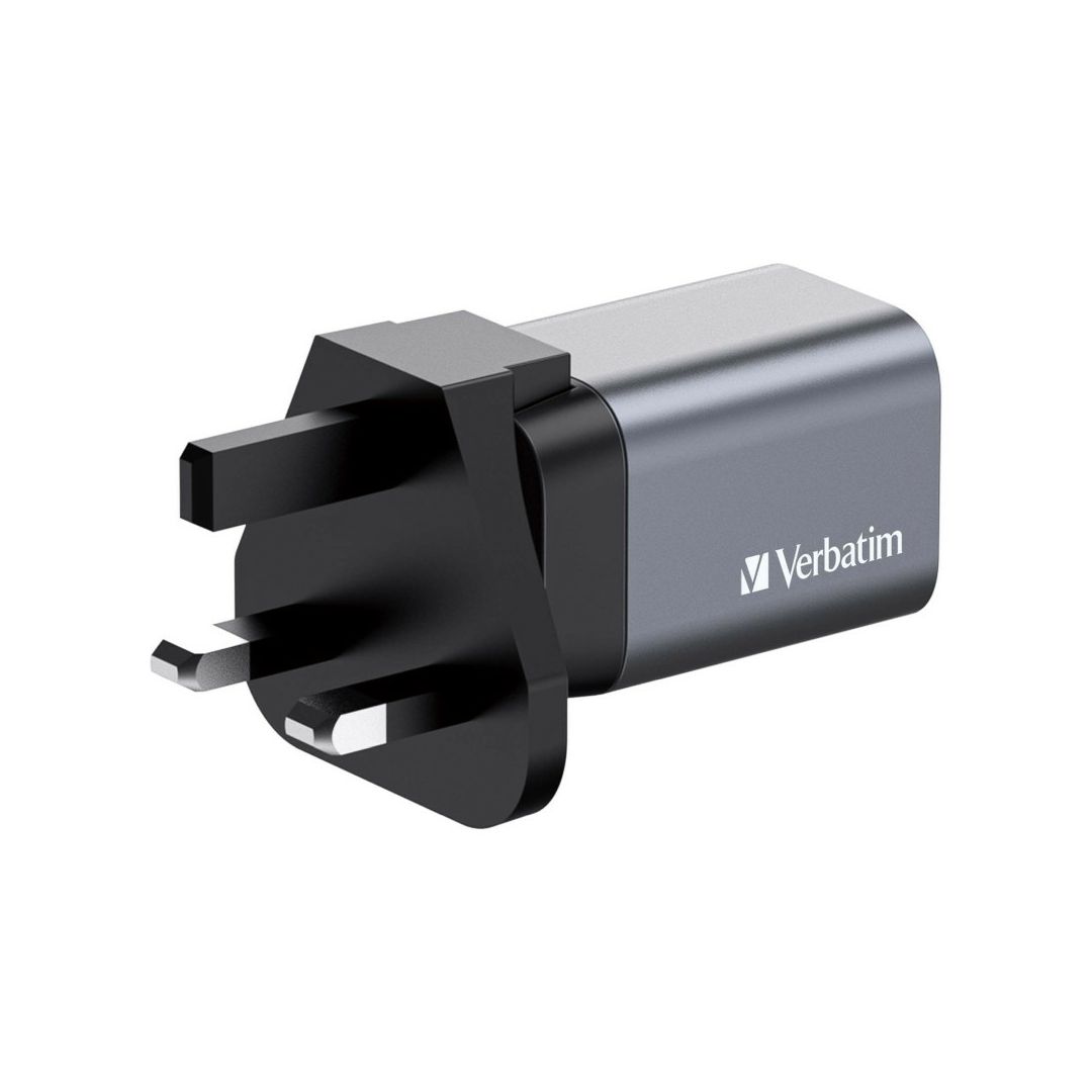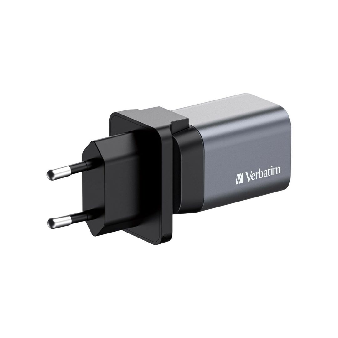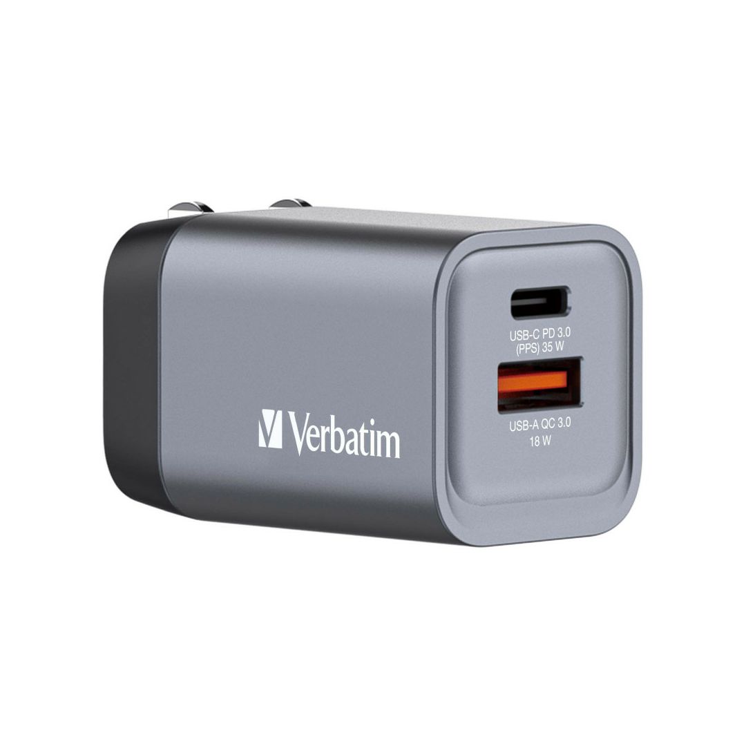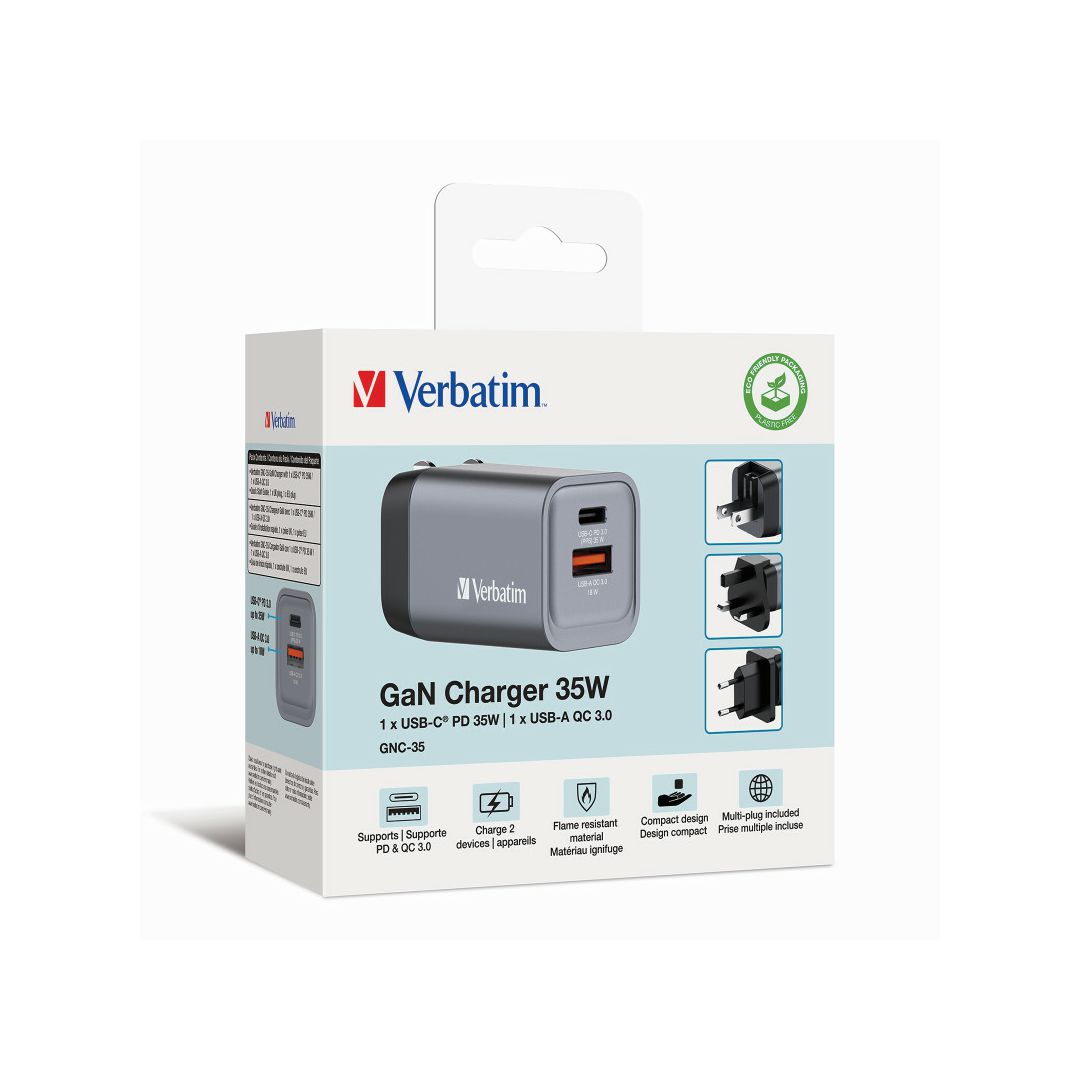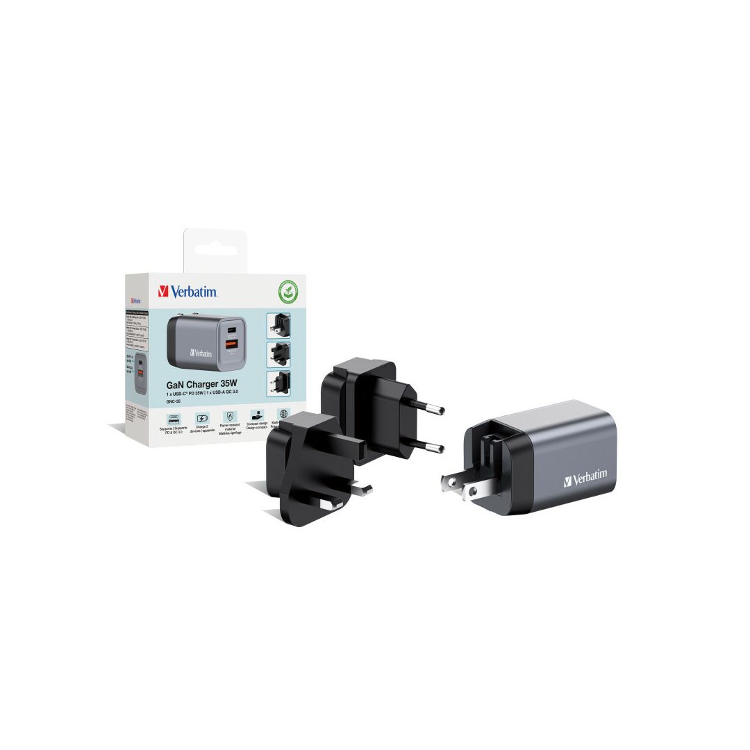 35w 2-in-1 Charging- Verbatim’s 35W GaN Wall Charger combines one USB-C PD 35W port and one USB-A QC 3.0 port in a sleek, palm sized design. Ideal for the office, home or travelling to power your tablet, smartphone, gaming devices, and more.- With its foldable US prongs and replaceable EU and UK plugs, it’s the ultimate travel companion.GaN Technology- Galliam Nitride (GaN) technology delivers high-powered, fast, efficient charging, and generates less heat. GaN chargers are smaller and lighter than traditional silicon-based chargers, making them ultra-portable and ideal for travel.Safe and Reliable- The GaN charger is made with high-quality, flame-resistant materials and features four safety protection systems, including over-current protection, over-voltage protection, short circuit protection, and over-temperature protection to ensure your safety while charging.Features- Supports charging of up to 2 devices simultaneously with a maximum total output of 35W- Equipped with 1 x USB-C® PD 3.0 up to 35W and 1 x USB-A QC 3.0 up to 18W- Integrated GaN technology provides efficient charging and generates less heat- Great travel companion thanks to foldable US prongs, replaceable EU and UK plugs and its slim, compact design- Supports super-fast charging with USB Power Delivery 3.0, PPS, and Quick Charge 3.0- Programmable Power Supply (PPS) technology delivers the right amount of power needed for the ideal charge- Great travel companion thanks to foldable US prongs, replaceable EU and UK plugs and its slim, compact design- Made with high-quality, flame-resistant materials and featuring four safety protection systems, including over-current protection, over-voltage protection, short circuit protection, and over-temperature protection- Plastic-free packaging- 2-year limited warrantySpecifications- Input Voltage: AC 100-240V 50/60 Hz 0.8 max.- Single port output:• USB-C PD 3.0: 5V = 3A, 9V = 3A, 12V = 2.92A, 15V ? 2.33A, 20V = 1.75A (35W max.)• PPS: 3.3-5.9V = 3A; 3.3-11V = 3A• USB-A QC 3.0: 3.6-6.5V = 3A, 6.5-9V = 2A, 9-12V = 1.5A (18W max.)- Combined port output:• QC+PD Output: 5V = 3.0A• Total Output: 35W max.- Safety protection systems:• Short circuit protection• Over-voltage protection• Over-current protection• Over-temperature protection- Material: Plastic Housing: PC Fireproof material- Dimensions (WxHxD): 49mm x 32mm x 31 mm- Weight: 56 grams
