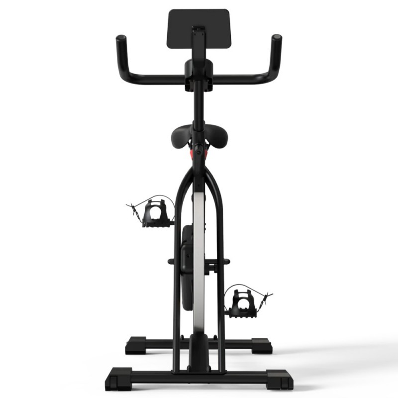Bicikl ima kočnicu za slučaj opasnosti, držač za tablet i bocu za vodu, što vam omogućuje dodatne pogodnosti za sigurno i ugodno vježbanje. Transportni kotači olakšavaju premještanje bicikla, tako da ga možete lako premještati po prostoriji. Njegov okvir je elegantnog, zaobljenog oblika, izrađen od 700 mm nehrđajućeg čelika.